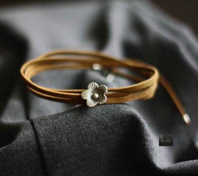 Minimalistyczna owijana bransoletka wykonana z zamszowego ekologicznego mięciutkiego mocnego rzemienia w kolorze ciepłego jasnego brązu oraz elementów z metalu antyalergicznego (wolne od ołowiu i niklu) w kolorze antycznego srebra (śr. kwiatuszka - 14mm) . Bransoletka regulowana za pomocą wygodnego zapięcia .