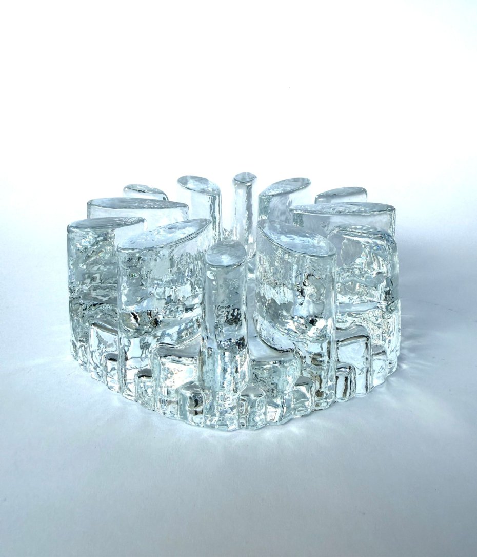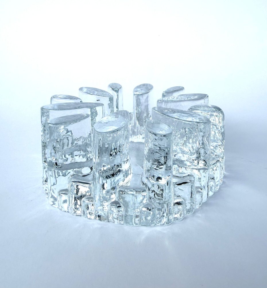 Wyjątkowy szklany podgrzewacz Bel Mondo wykonany z masywnego, przejrzystego szkła formowanego w charakterystyczny, rzeźbiarski wzór. Segmentowa, "lodowa" struktura pięknie rozprasza światło świecy, tworząc efekt dekoracyjnej poświaty typowej dla skandynawskiego wzornictwa z drugiej połowy XX wieku.