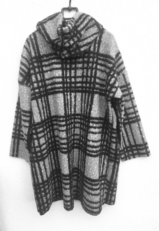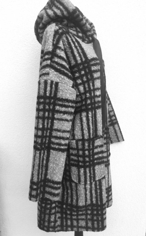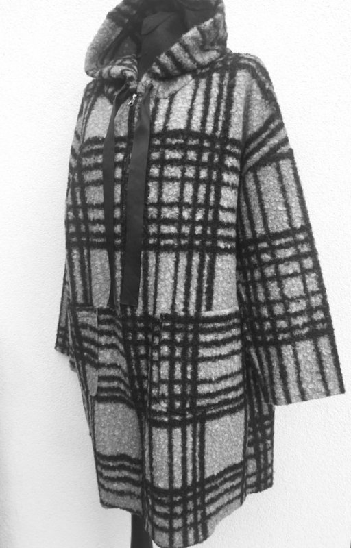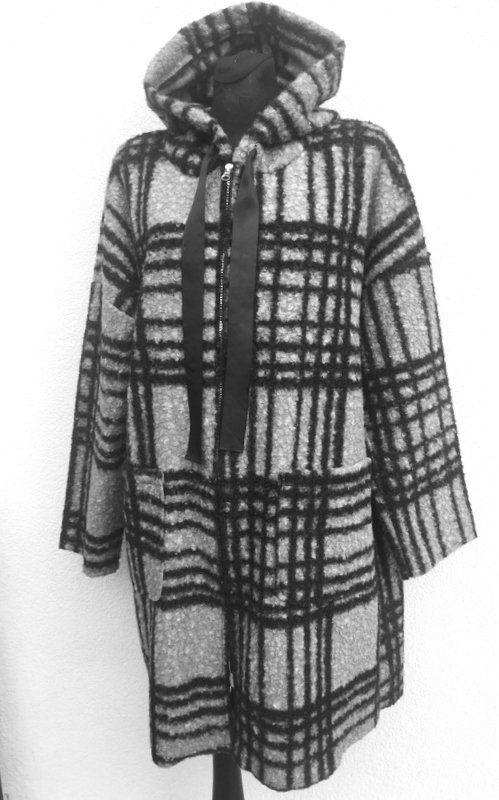 Luźny oversizowy płaszcz z tkaniny z fakturą boucle w szaro -czarnej kolorystyce. Minimalistyczny prosty krój z obniżoną linia ramion, z kapturem ściąganym rypsowymi taśmami . zapinany na zamek . Bez podszewki. Na wiosnę i jesień.