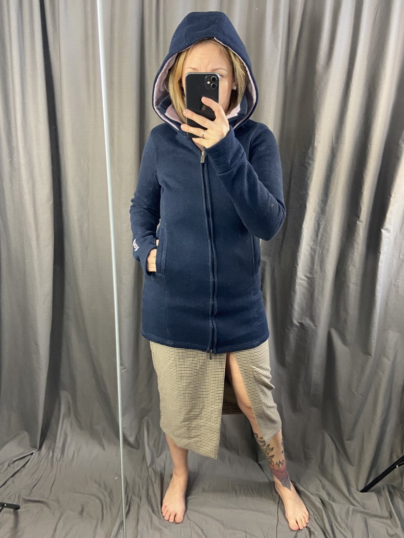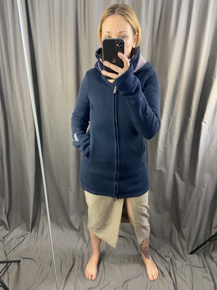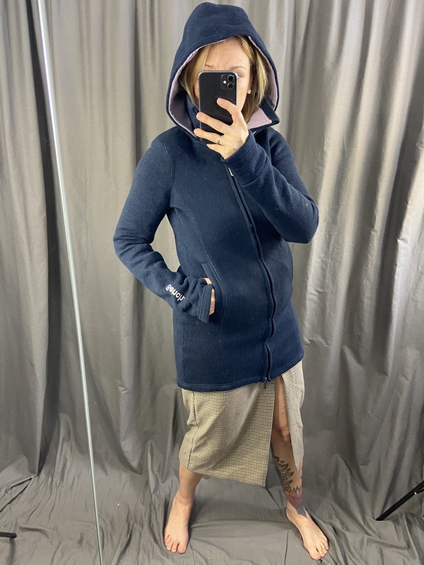 Długi kardigan z kapturem od Bench. Od spodu polarek. Wierzch akryl 70% i wełna 30%, polarek z poliestru.
