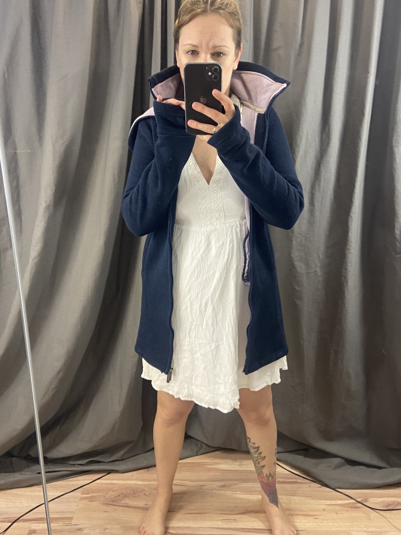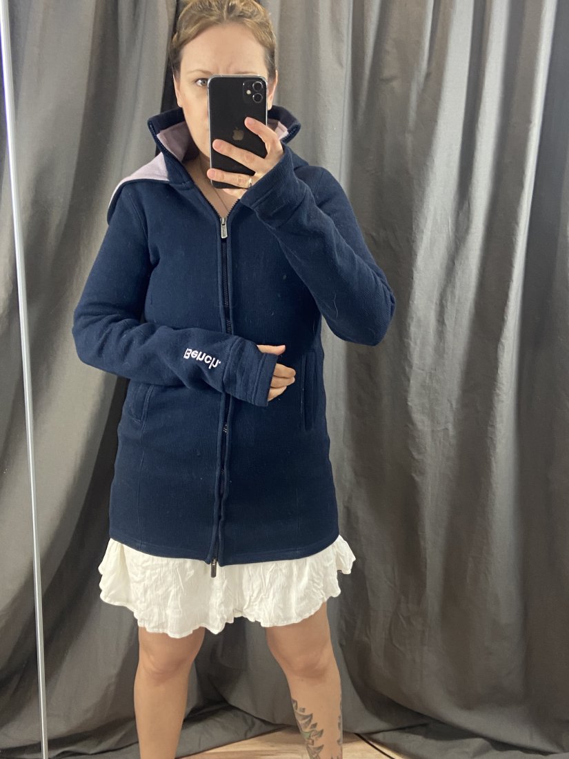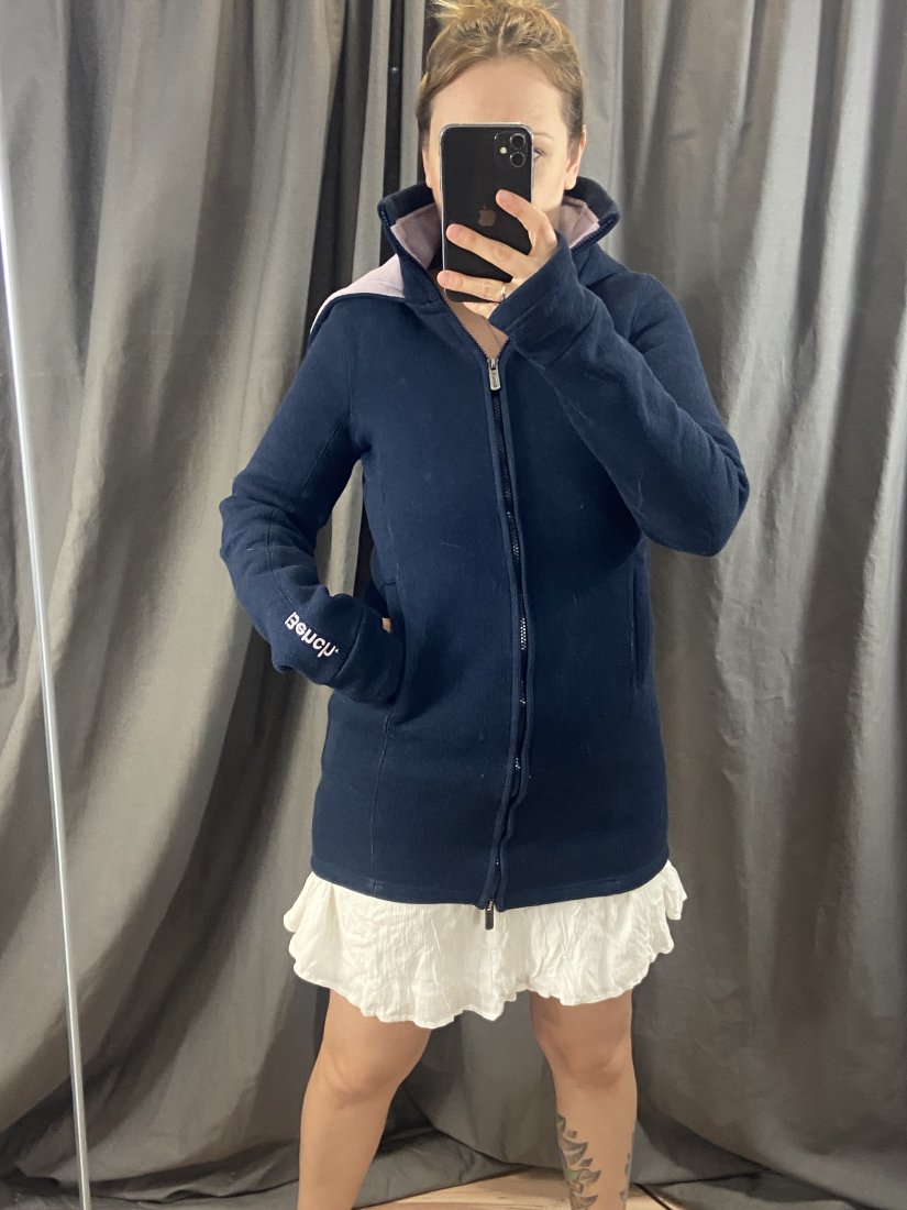 Długi kardigan z kapturem od Bench. Od spodu polarek. Wierzch akryl 70% i wełna 30%, polarek z poliestru.