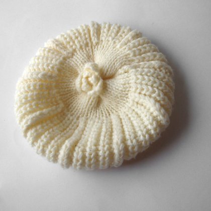 Uroczy beret wełniany w kolorze ecru. Antenka w kształcie kwiatuszka.