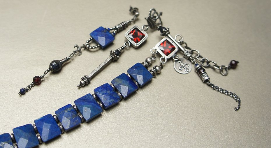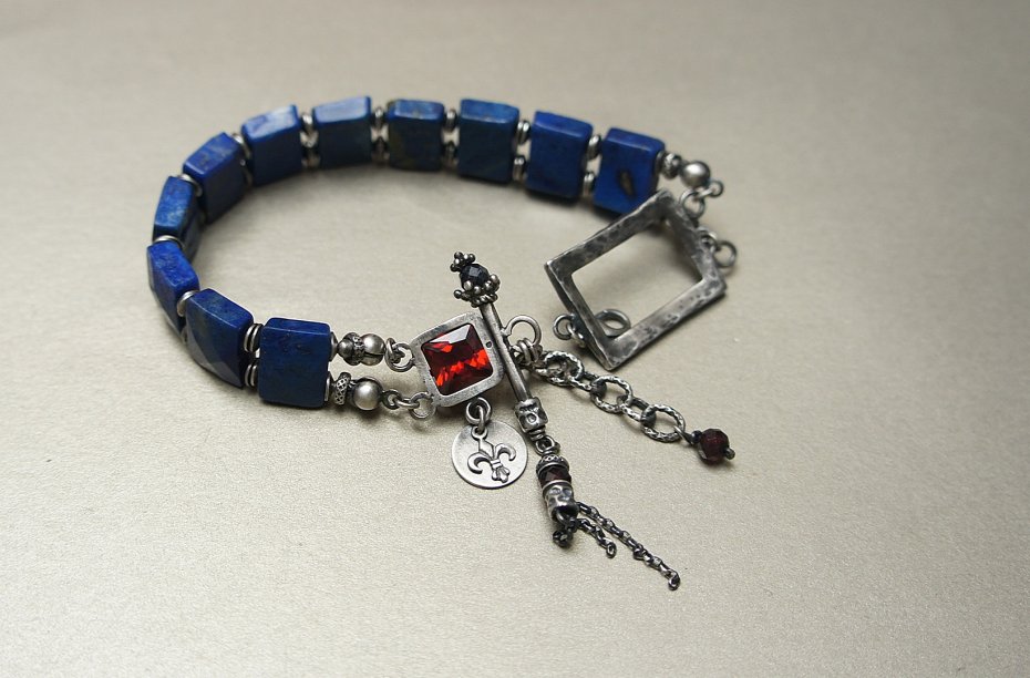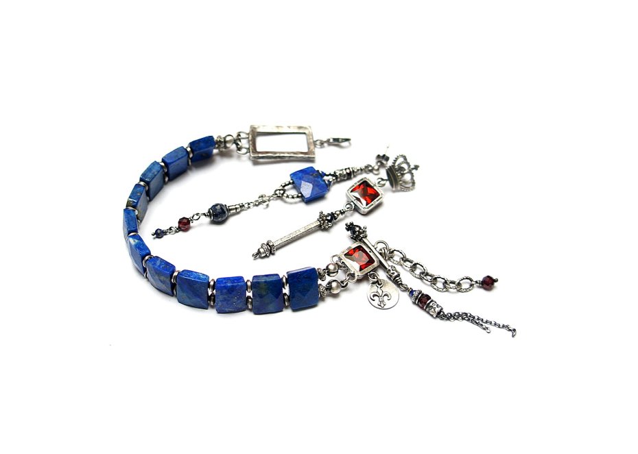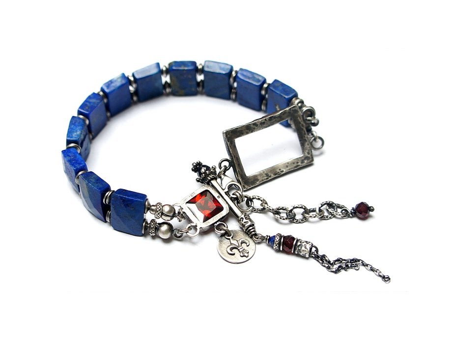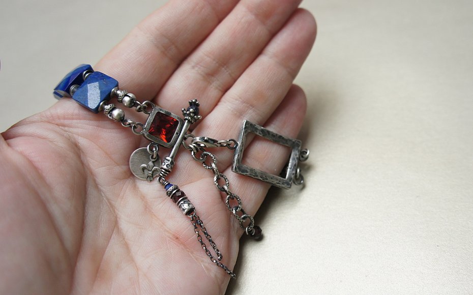 Bransoletka wykonana własnoręcznie w całości ze srebra [pr. 925] w połączeniu z fasetowanymi pastylkami lapis lazuli [12mm x 9mm], fasetowanymi kuleczkami granatów [4mm] ,kuleczką szafiru [4mm] ,kuleczką lapisu lazuli [2mm] oraz winną cyrkonią[8mm x 8mm]. Całość oksydowana i przetarta. Długość bransoletki: ok. 20cm plus ozdobna przedłużka. Biżuteria ozdobnie zapakowana. Jedyny egzemplarz. Do kompletu można dokupić kolczyki przedstawione na zdjęciach.