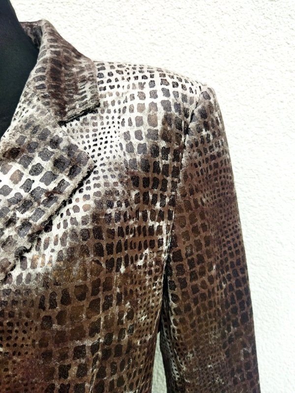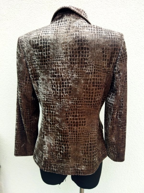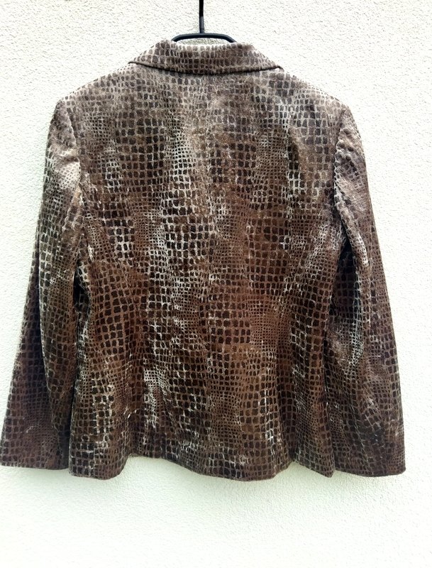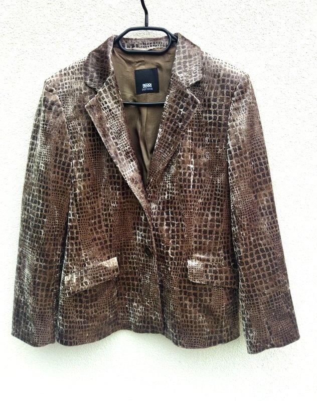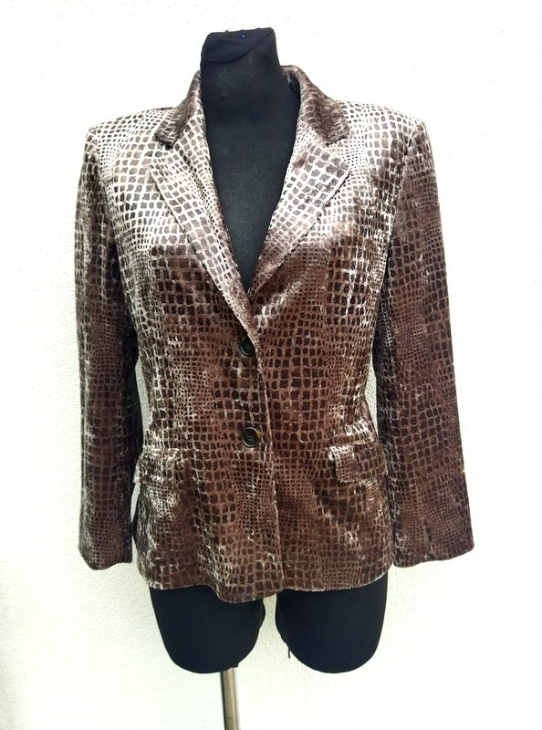 Zgrabna marynarka z poliestrowej welurowej tkaniny w odcieniach brązu i beżu. Z kołnierzem z rewersami, z dwiema wpuszczanymi kieszeniami z patkami. Zapinana na dwa guziki. Całość na podszewce