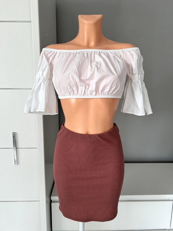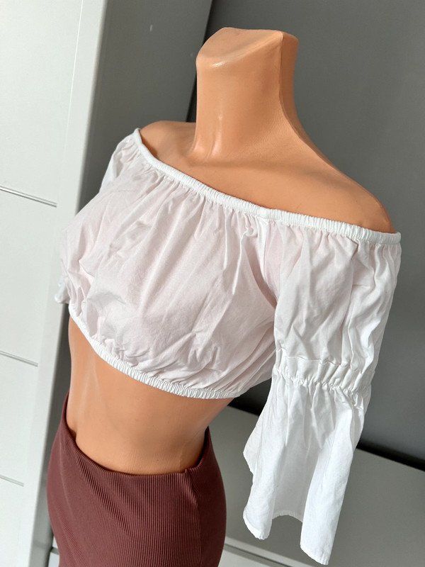 Crop top marki Bershka, rozmiar z metki to S 36. Wykonany w 100% z bawełny. Na górze i na dole posiada gumkę, więc idealnie dopasowuje się do sylwetki. Ma szerokie rękawy.
