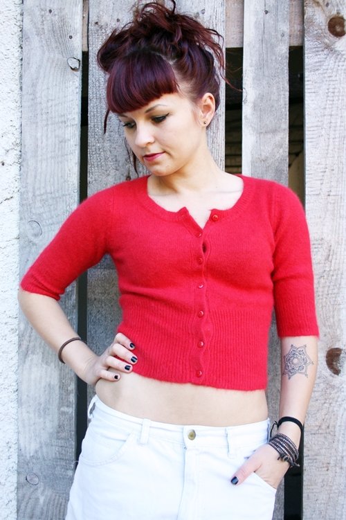 Czerwony sweterek z milutkiej angorki, rekaw 3/4. firma bershka. rozmiar z metki M , ale moim zdaniem to xs/s,osoba na zdj.właśnie taki rozm.nosi