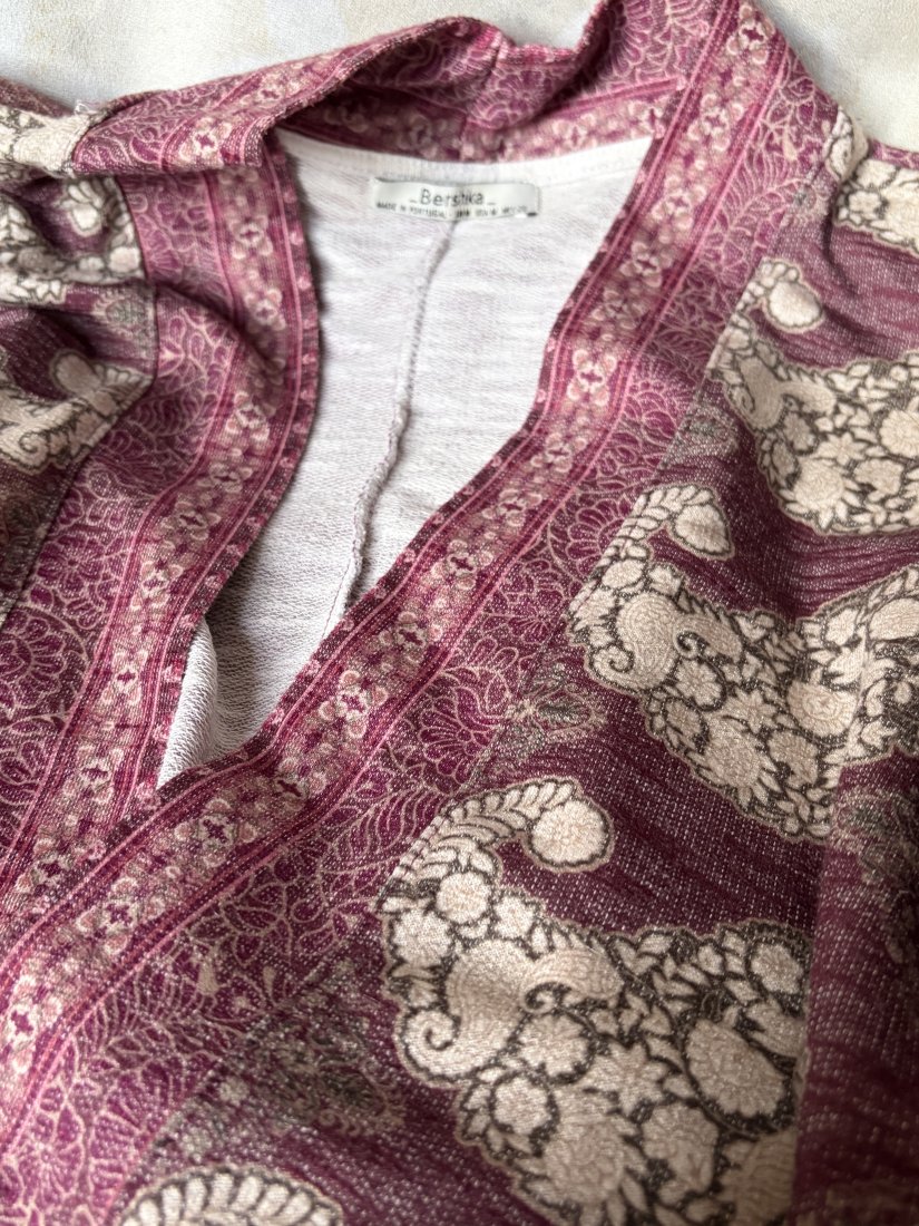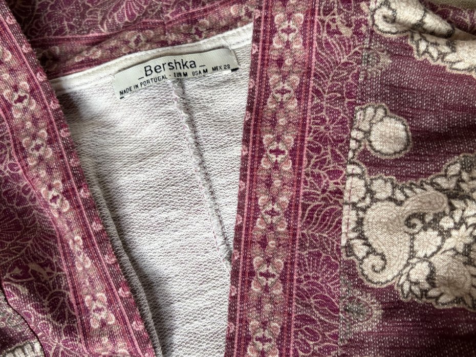 Bershka made in Portugal 26% cotton 71 % polyester 3 % elastan . Miękka i przyjemna w dotyku narzutka - sweter bez zapięcia . Tkanina dzianinowe z orientalnym wzorem . Opuszczone ramiona , lekko miękko wykończony dół . Ramie 42 cm długość z rękawem 78 odcięcie z przodu 4,5 cm pachy około 65 długość prawie 80 cm