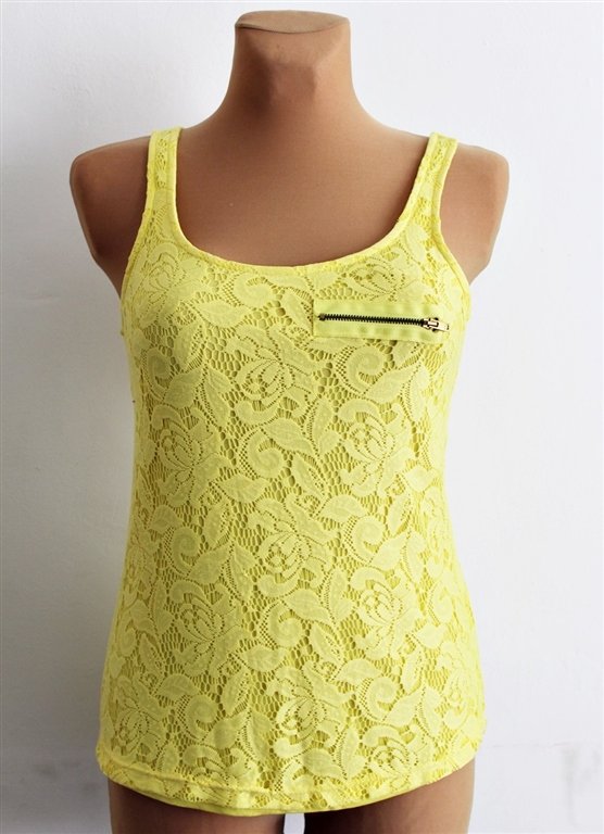 Kolor żółty, przód koronkowy, tył gładki. Z przodu efektowny ekspres.