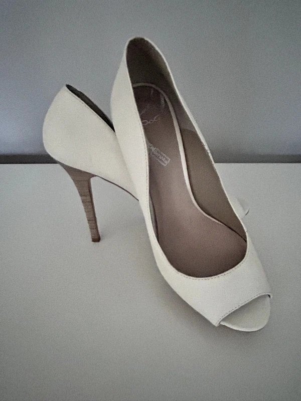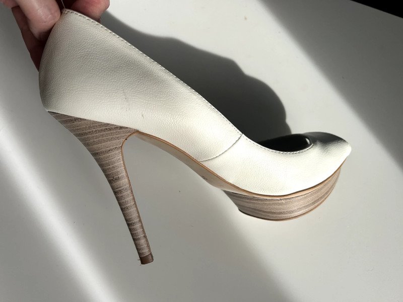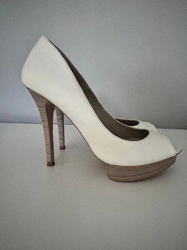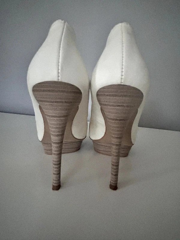 Szpilki w kolorze ecru na delikatnej beżowej platformie i obcasie. Rozmiar 37, długość wkładki 24 cm, wysokość obcasa 11,5 cm, wysokość platformy ok. 2,5 cm. Bardzo kobiece seksowne, pięknie prezentują się na nodze. Wszystkie wady pokazane na zdjęciach, nie rzucają się bardzo w oczy.