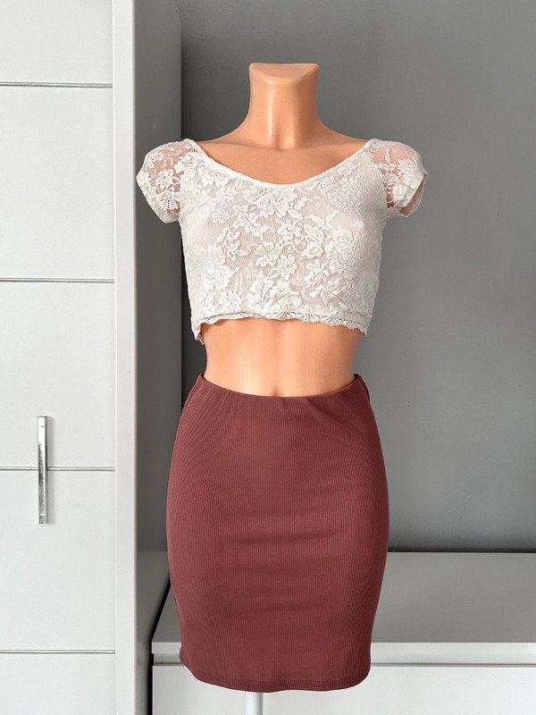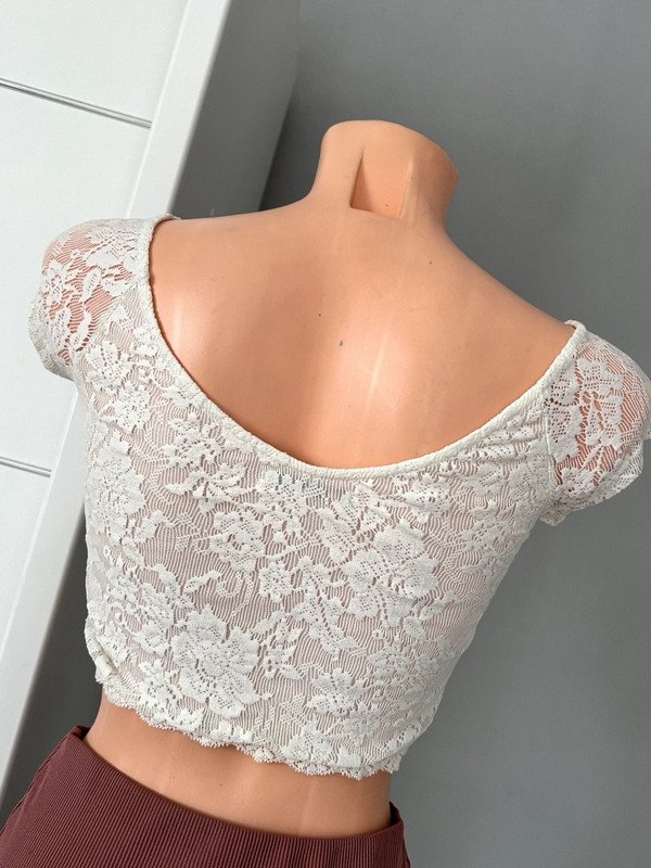 Crop top marki Bershka, rozmiar z metki to S 36. Posiada podszewkę, więc nie przebija. Wykonany w 100% z wiskozy. Ma piękną koronkę, dopasowuje się do sylwetki.