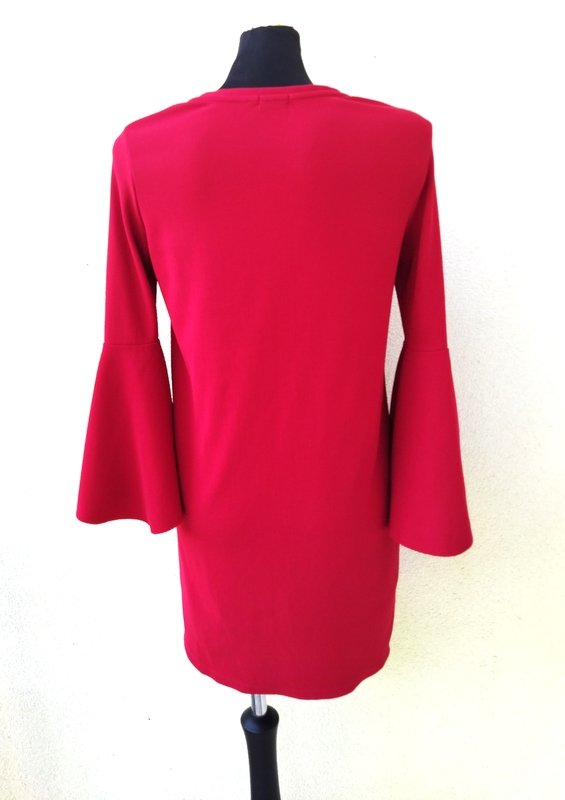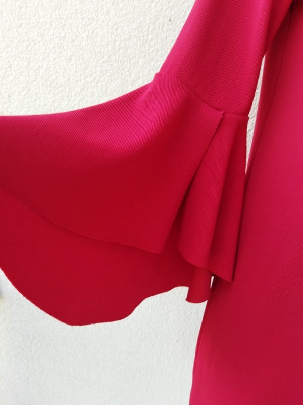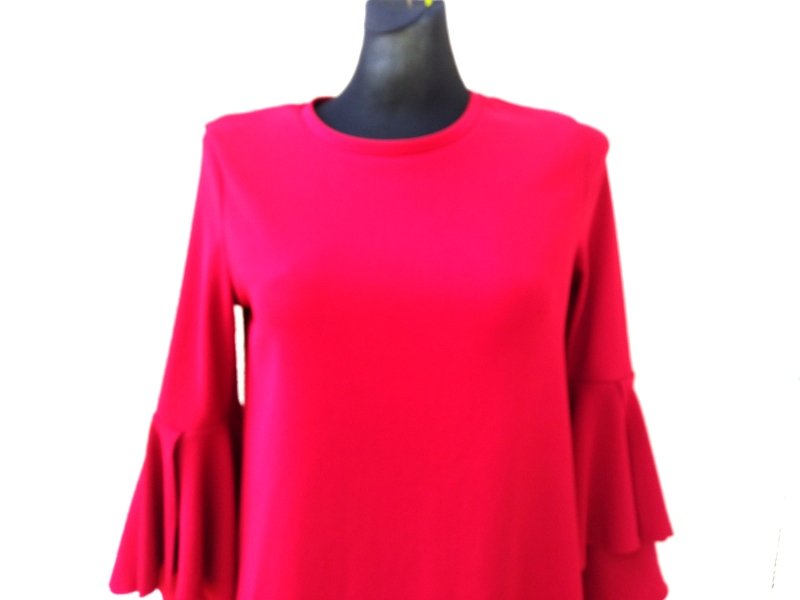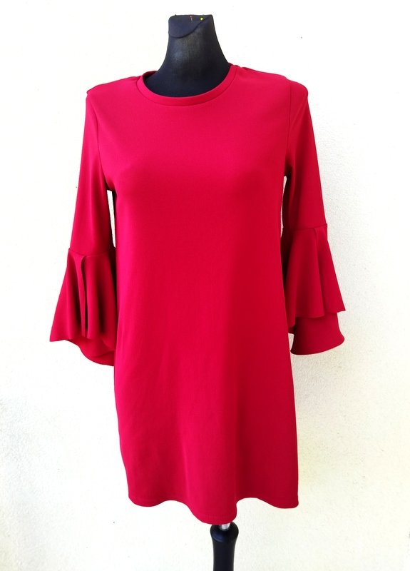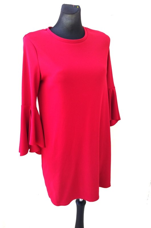 Sukienka o minimalistycznym kroju z tkaniny dzianinowe w kolorze jarzębinowej czerwieni. Trapezowy fason z fantazyjną falbaną u rękawów.
