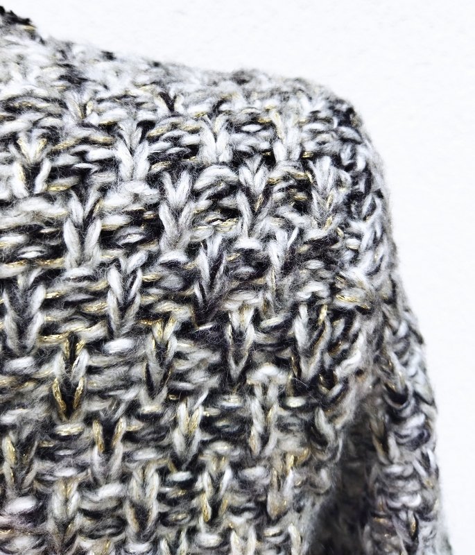 Dłuższy swetertypu kardigan z grubszej puszystej akrylowej włóczki w melanżowej kolorystyce szarości, złamanej bieli i czerni z wplecioną dyskretną metaliczną nitką w złotym kolorze. Bez kołnierza z poziomo wszywanym w pasie czarnym zamkiem. Fason otwarty z możliwością zapięcia na haftkę