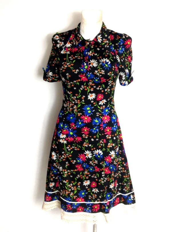 Czarna sukienka od Betty Barclay o fasonie rozkloszowanym w piękne kolorowe kwiaty,dół sukienki wykończony ażurową grubszą koronką w kolorze przybrudzonej bieli, sukienka posiada szpiczasty kołnierzyk i zapinana jest do wysokości biustu na perłowe guzki, z tyłu zasuwana na suwak. Posiada podszewkę.