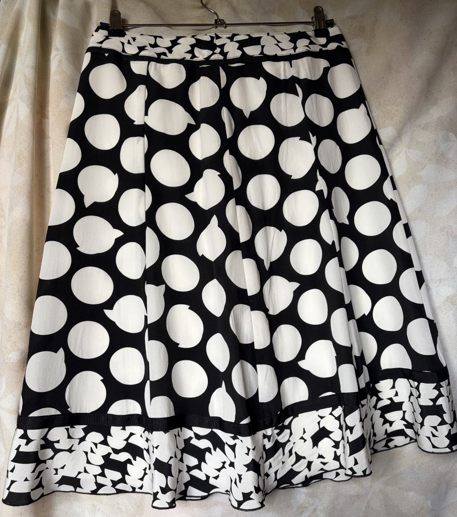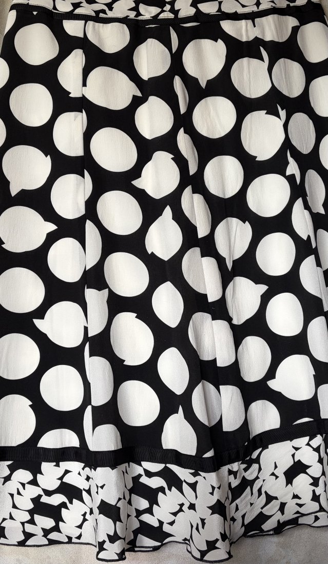 Efektowna , elegancka - Black & White 100 % SILK . BETTY BARCLAY COLLECTION 5756 2457 . Dwuwarstwowa jedwabna oryginalna , zwiewna , rozkloszowana spódnica . Suwak z boku . Warstwa wierzchnia jedwab, jakościowy, szlachetny . Cięte ze skosu pasy i "falbana " sprawiają , że pięknie się układa i wiruje przy chodzeniu. pas na górze do noszenia poniżej talli ( gdyby chcieć ) Czerń i kredowa biel o subtelnym jakby perłowym połysku. Podszewka a acetat. Tasiemka przy falbance i przy pasku . Talia 38 pasek około 3,5 cm biodra około 57 długość całkowita 62 falbana 8 z tasiemką 10 cm Szerokość na dole tam gdzie tasiemka 90 cm x 2 Stan zachowania bardzo dobry . Metki zarówno firmowa jak i ze składam wciąż obecne :) Proszę o sprawdzenie wymiarów . Wymiary mierzone na płasko .