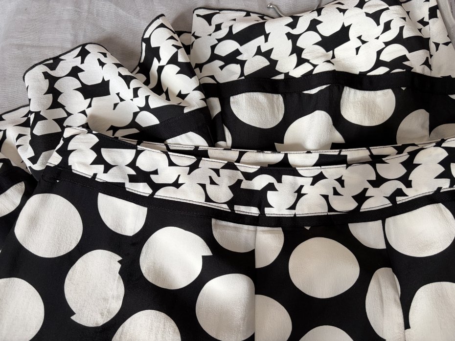 Efektowna , elegancka - Black & White 100 % SILK . BETTY BARCLAY COLLECTION 5756 2457 . Dwuwarstwowa jedwabna oryginalna , zwiewna , rozkloszowana spódnica . Suwak z boku . Warstwa wierzchnia jedwab, jakościowy, szlachetny . Cięte ze skosu pasy i "falbana " sprawiają , że pięknie się układa i wiruje przy chodzeniu. pas na górze do noszenia poniżej talli ( gdyby chcieć ) Czerń i kredowa biel o subtelnym jakby perłowym połysku. Podszewka a acetat. Tasiemka przy falbance i przy pasku . Talia 38 pasek około 3,5 cm biodra około 57 długość całkowita 62 falbana 8 z tasiemką 10 cm Szerokość na dole tam gdzie tasiemka 90 cm x 2 Stan zachowania bardzo dobry . Metki zarówno firmowa jak i ze składam wciąż obecne :) Proszę o sprawdzenie wymiarów . Wymiary mierzone na płasko .