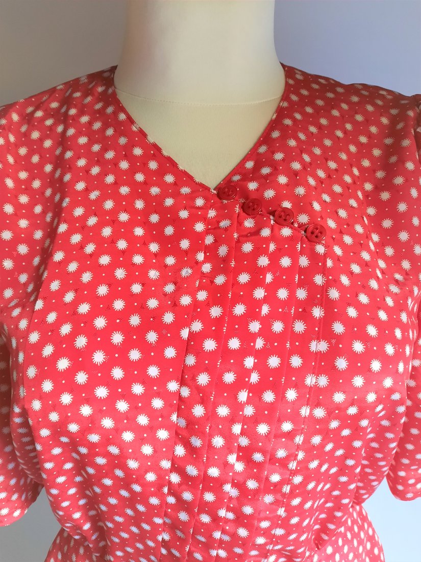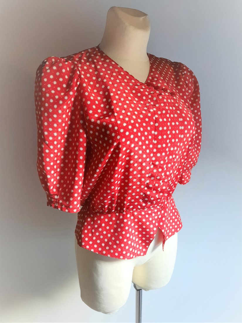 urocza krótka bluzka vintage z lat 80/90-tych, w kolorze czerwonym z białym nadrukiem przypominającym słońce, bufiasty zwężany rękawek sięgający łokci, w ramionach poduszki, bluzka zapinana po skosie na kryte guziki, dodatkowo przy dekolcie również zapięcie na guziki, w pasie bluzka odcinana i zapinana na jeden guzik, z baskinką