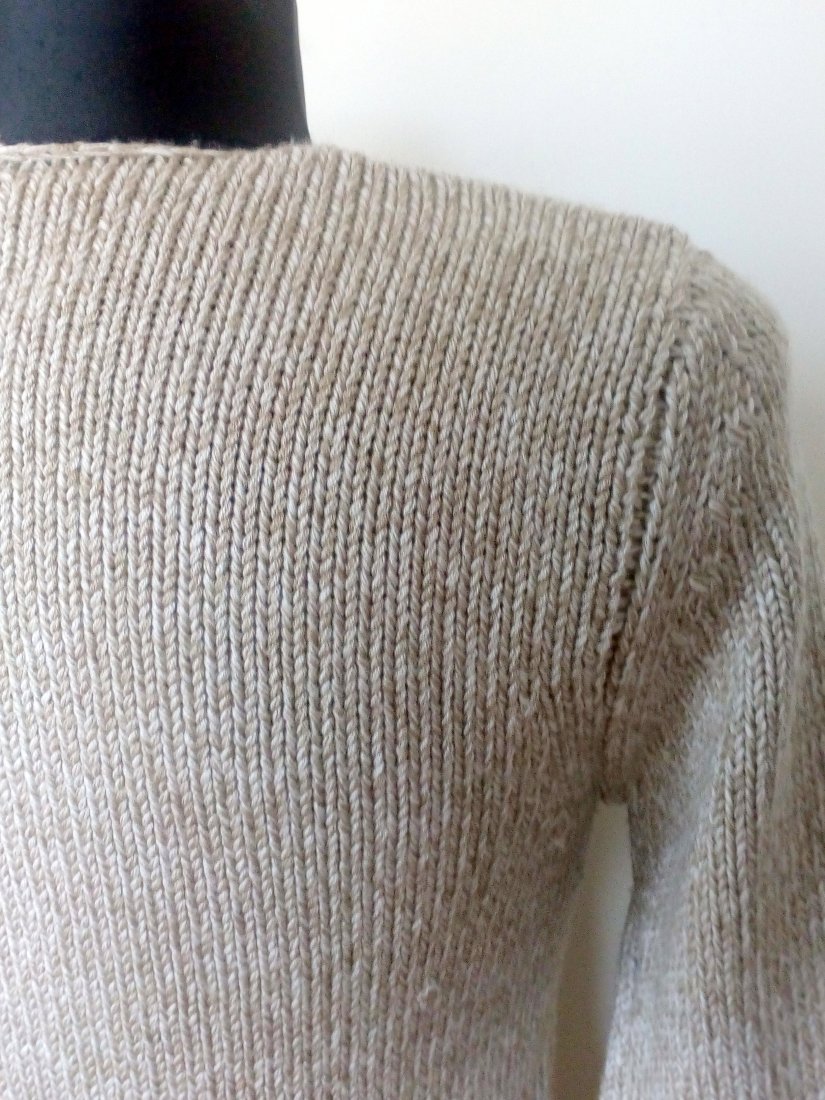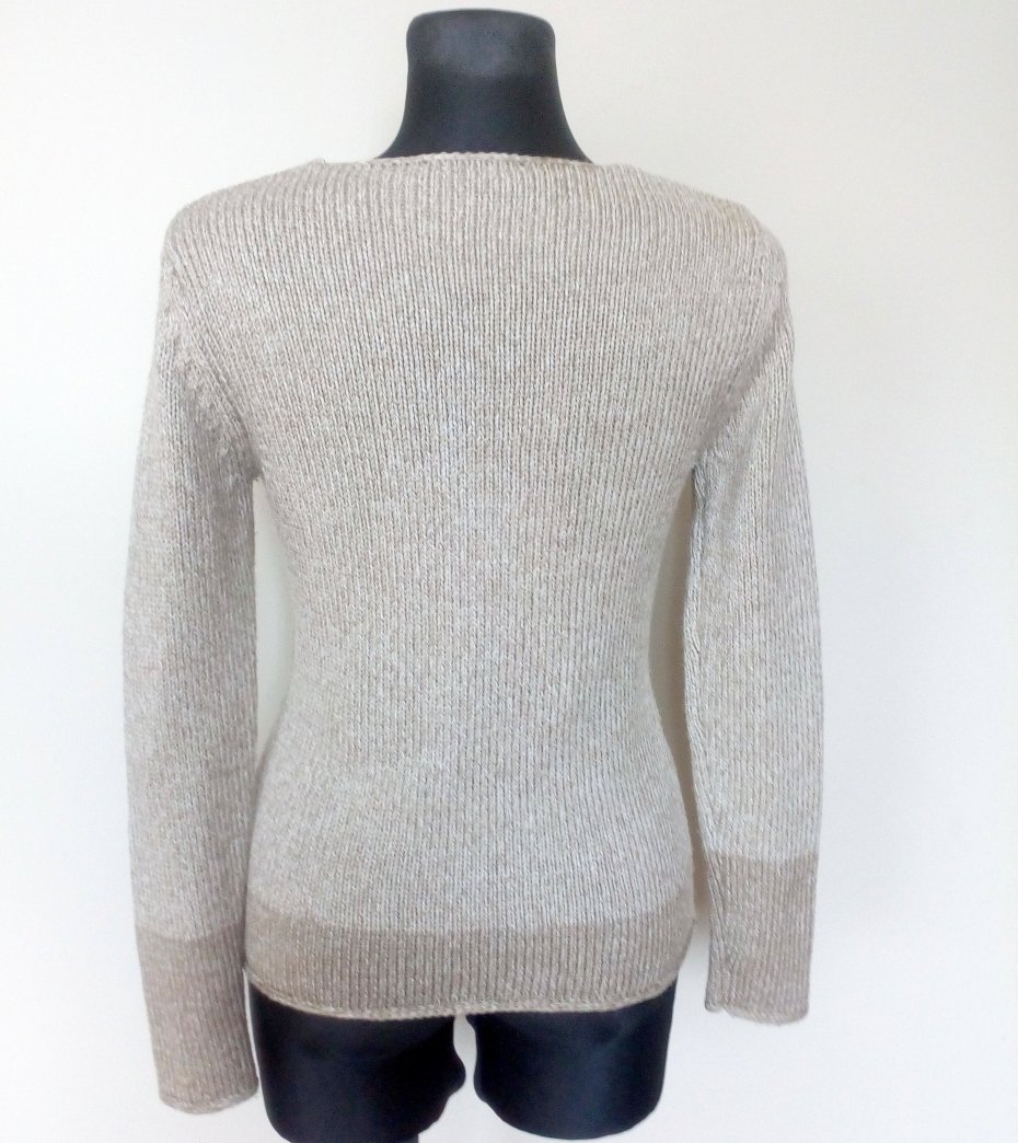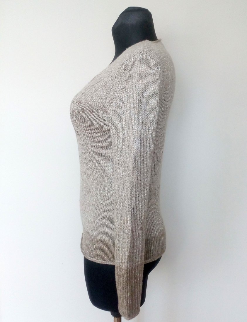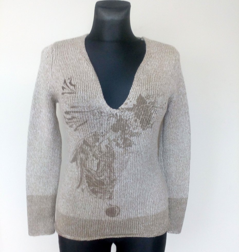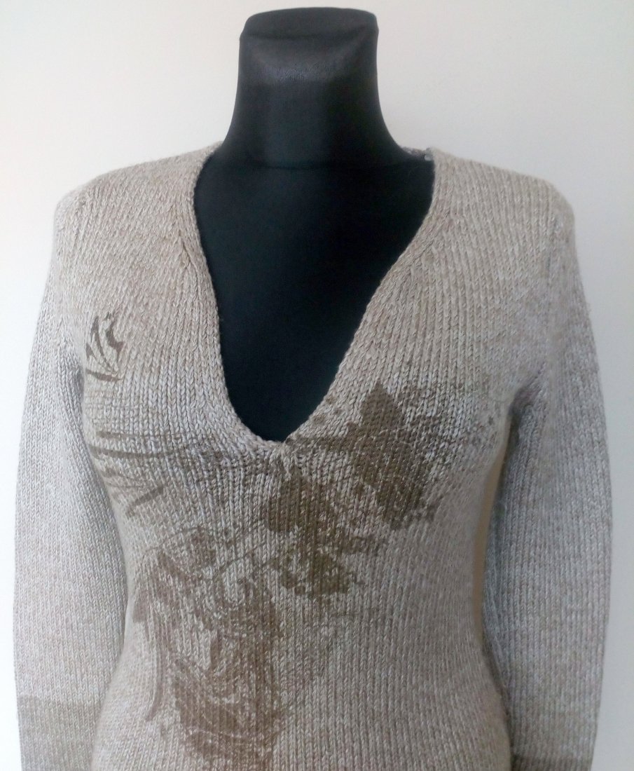 Przyjemny sweter z udziałem wełny merynosów, w melanżowym kolorze - jasny i ciemny beż, fason blisko ciała, wzór na przodzie, głębszy dekolt