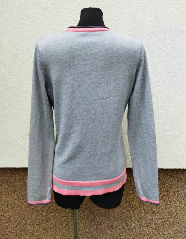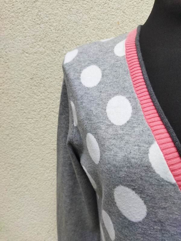 Miły, miękki sweterek typu kardigan w szaro - biało- malinowej kolorystyce. Dekolt w szpic, zapinany na guziki.
