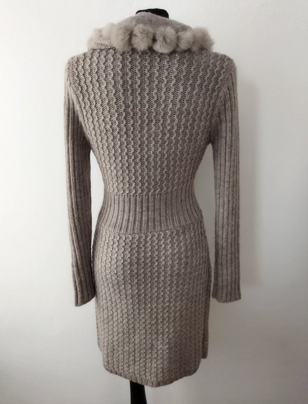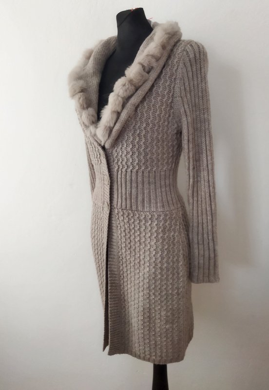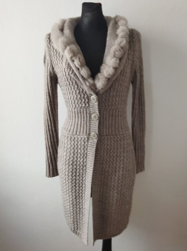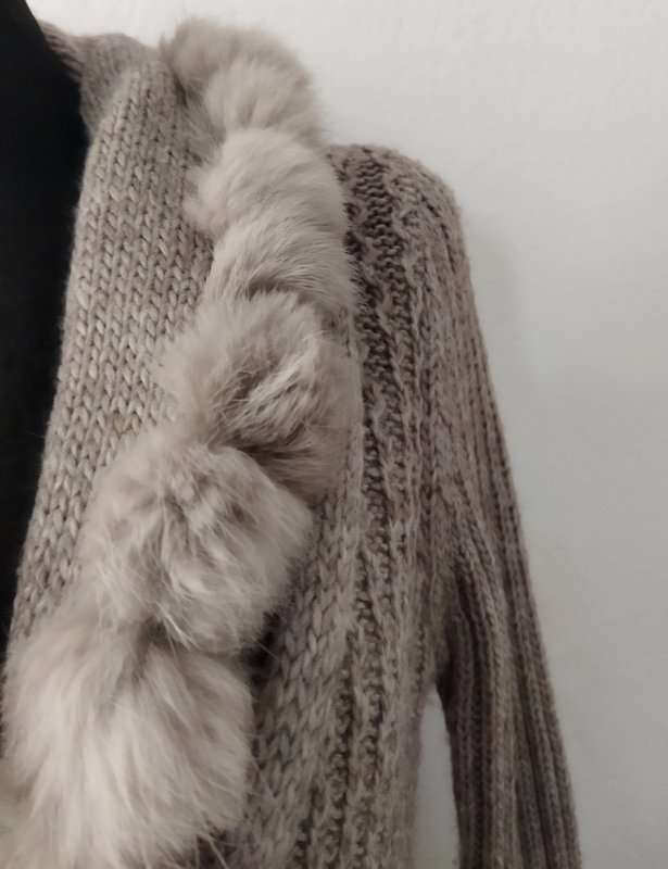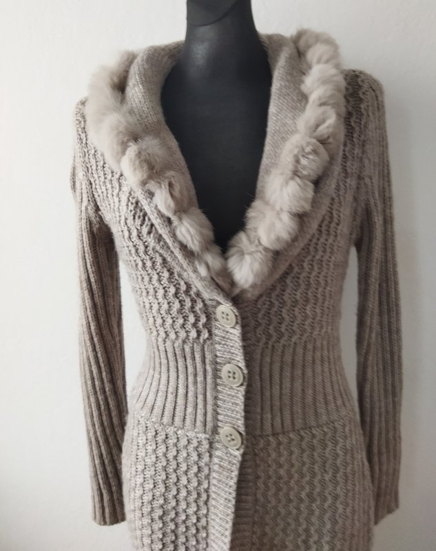 Zgrabny dobrej jakości dłuższy sweter w melanżowym kolorze cappuccino, wykonany ozdobnymi ściegami, taliowany z podwójnym szalowym kołnierzem - wierzchni zdobiony pomponami z króliczego futerka, talia podkreślona ściągaczowym wzorem. Zapinany do pasa na sygnowane guziki.