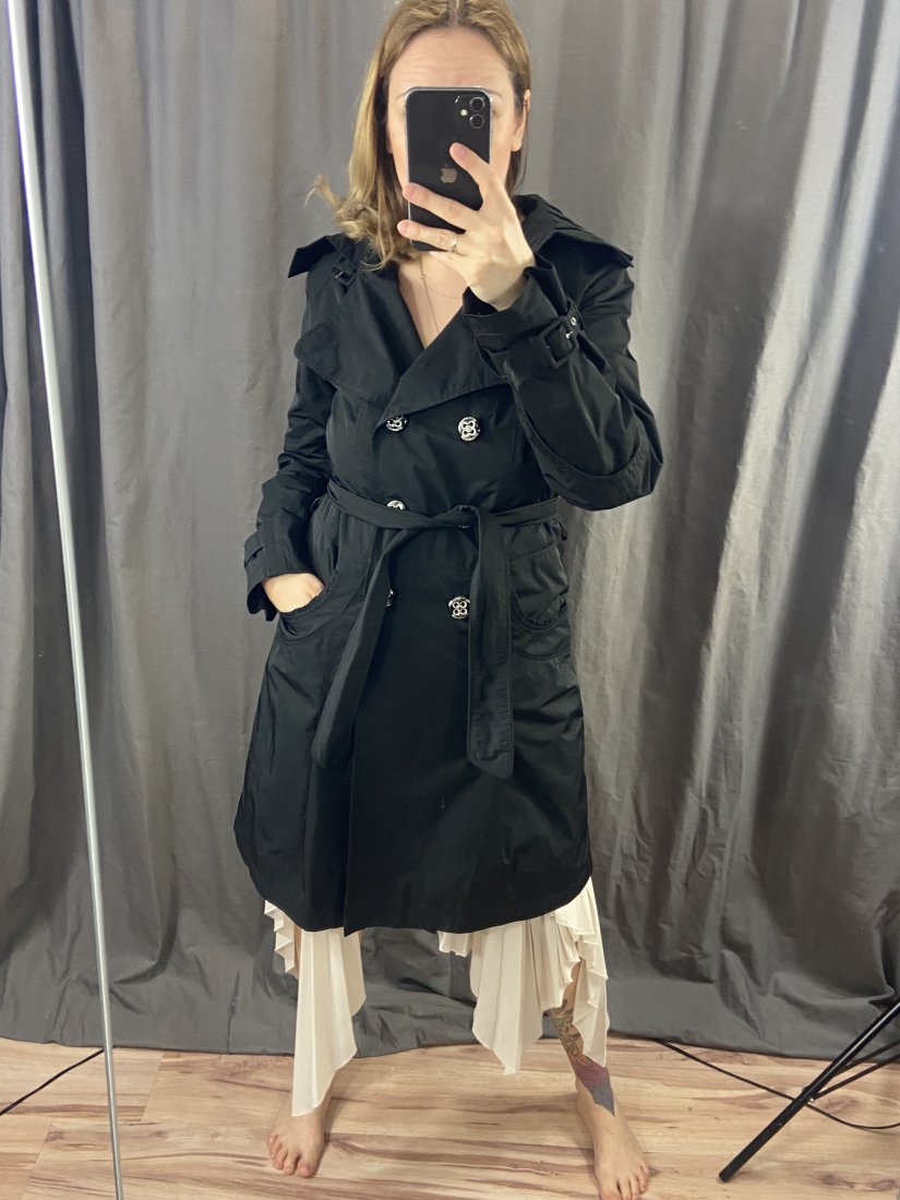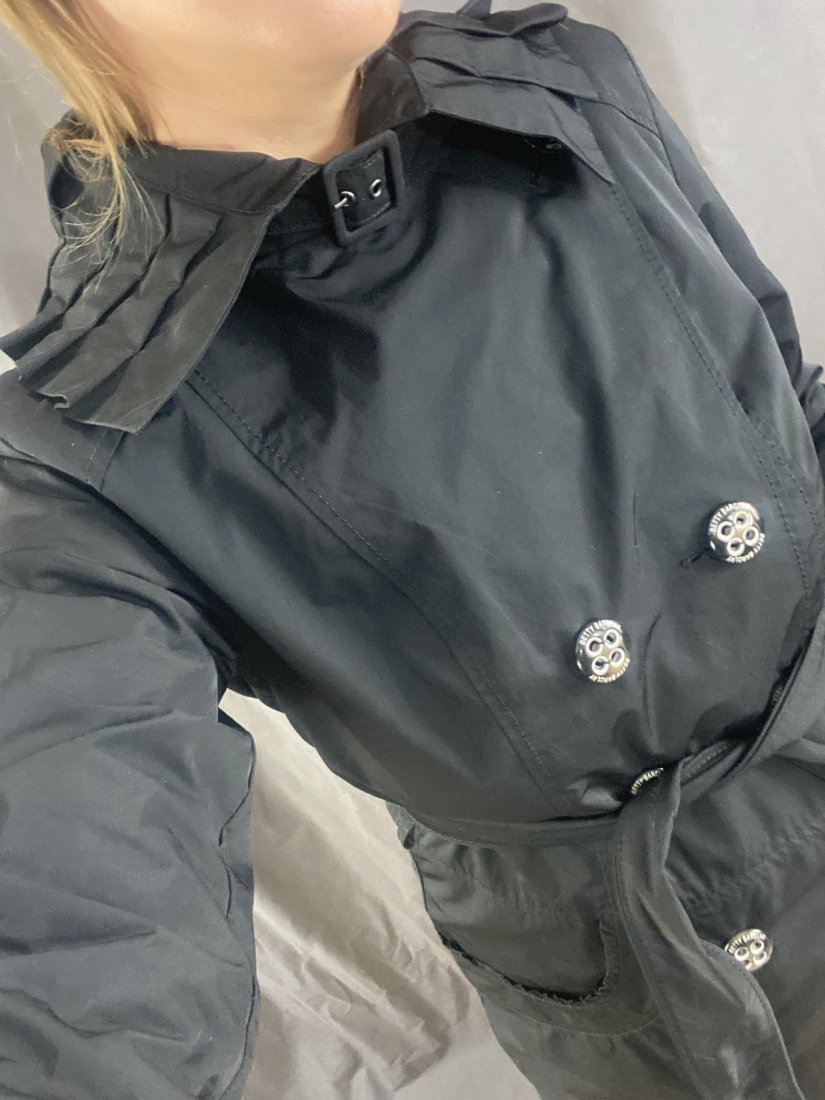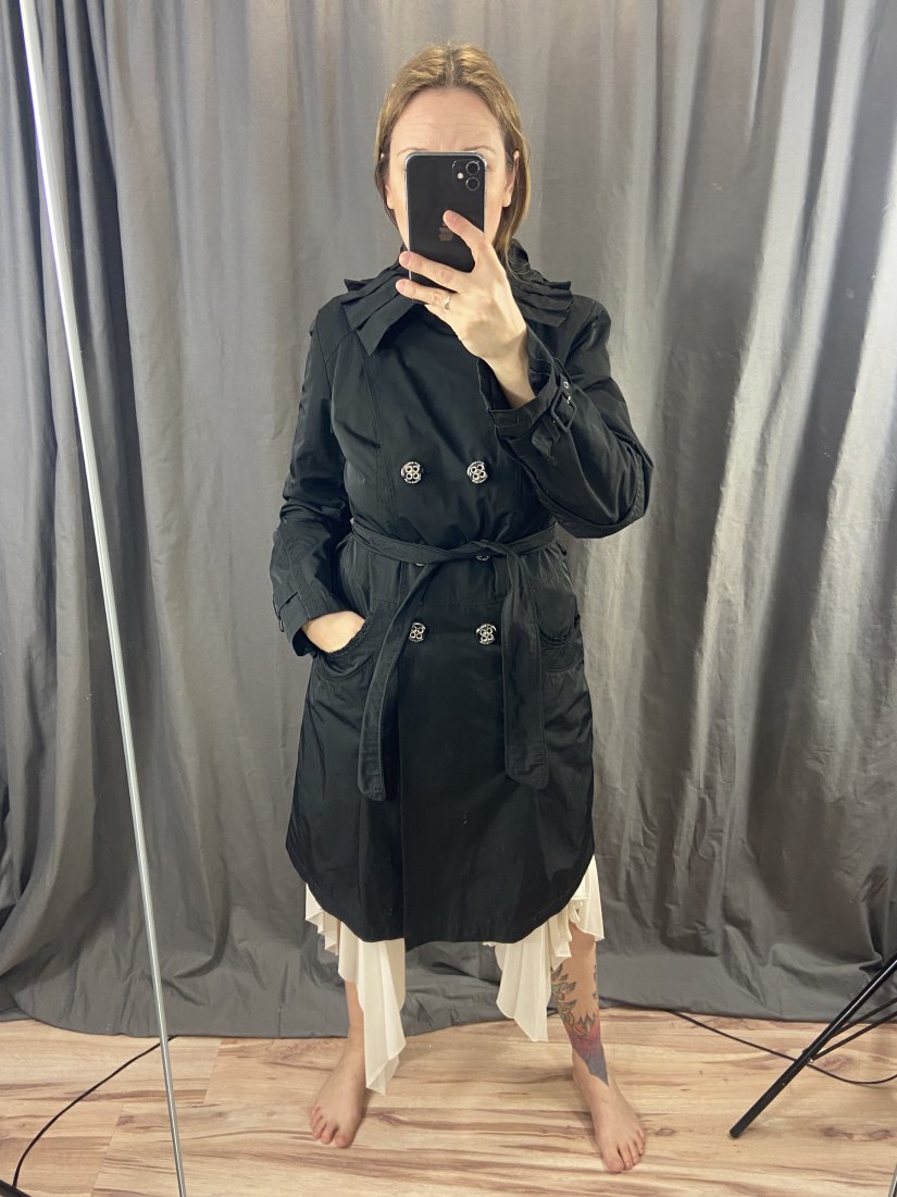 Betty Barclay. Wiosenny trencz klasyczny, z zupełnie nieklasycznym kołnierzem. Duże logowane guziki. Wiązany w pasie. Materiał to poliester, posiada podszewkę. Płaszcz świetnie się układa.