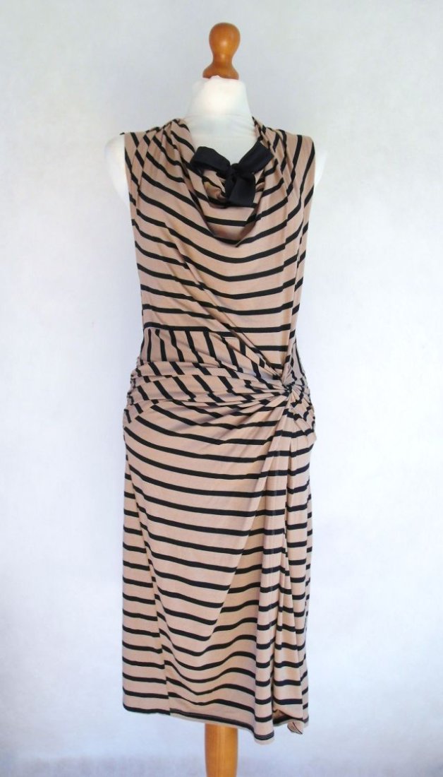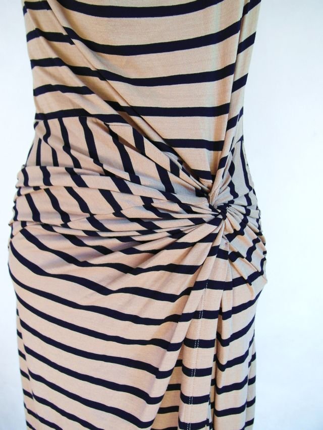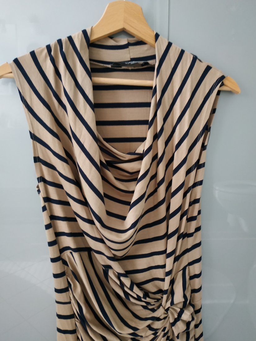 beż w odcieniu ciemniejszym z granatowymi, cieńszymi paskami. dekolt drapowany,luźny. w pasie fantazyjnie zebrany i "skręcony" materiał, dół prosty. wysmuklająca pomimo poziomych pasków.