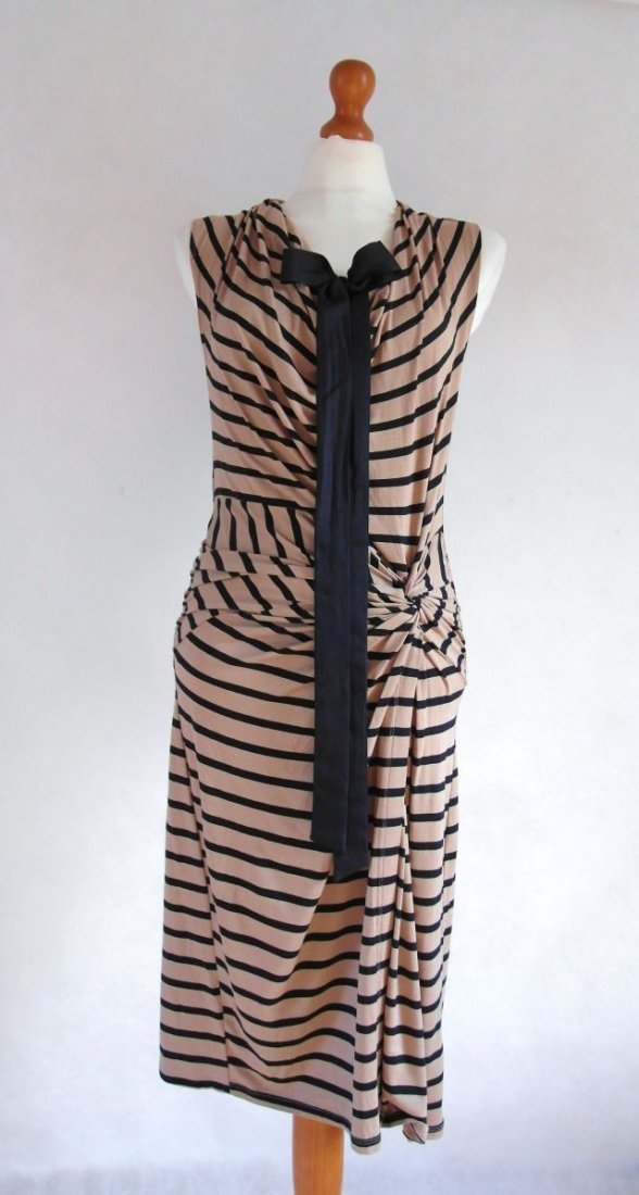 beż w odcieniu ciemniejszym z granatowymi, cieńszymi paskami. dekolt drapowany,luźny. w pasie fantazyjnie zebrany i "skręcony" materiał, dół prosty. wysmuklająca pomimo poziomych pasków.