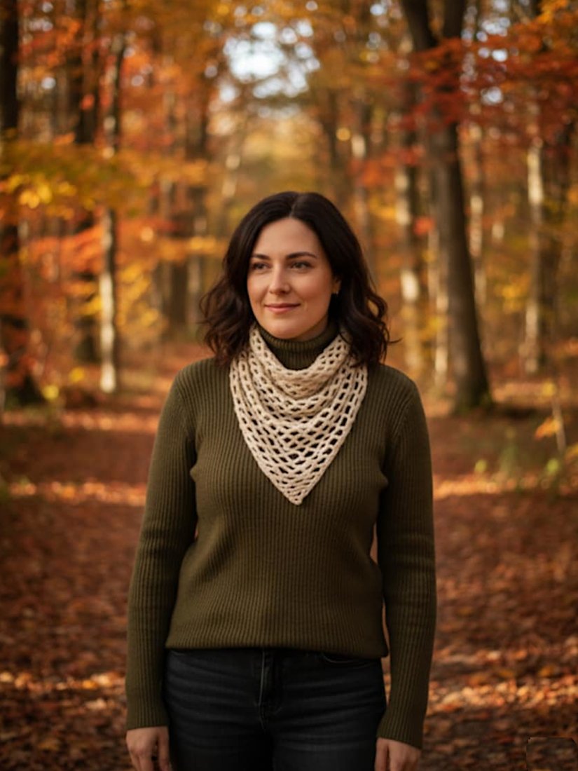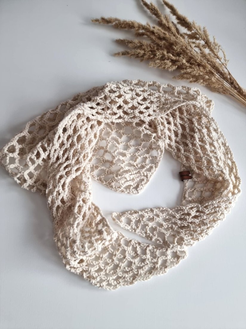 Wykonana szydełkiem z wyjątkowo delikatnej włóczki, tworzy misterną siateczkę oczek, dzięki której pięknie układa się na szyi lub włosach.
