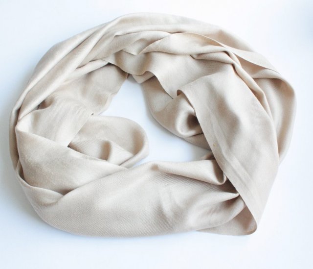 Duży, elegancki szal w stonowanym odcieniu beżu.