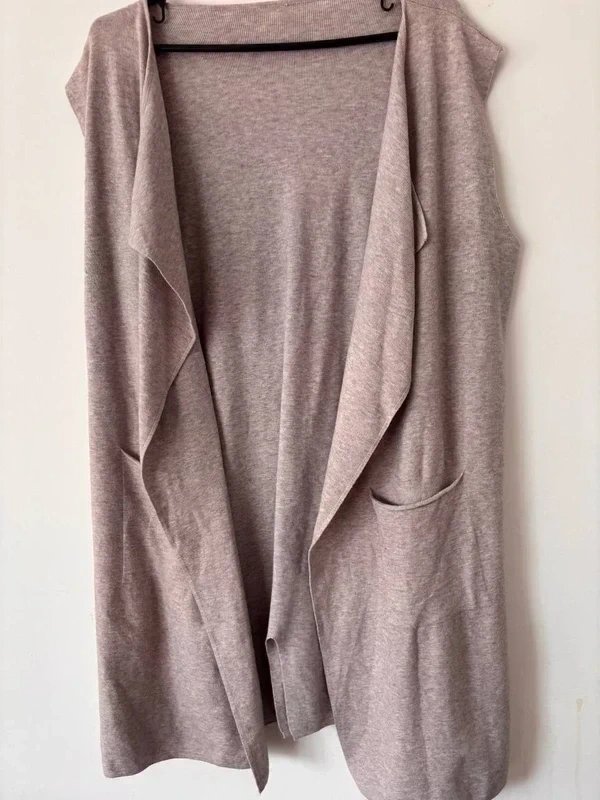 Długa, beżowa kamizelka swetrowa o prostym, eleganckim kroju.
