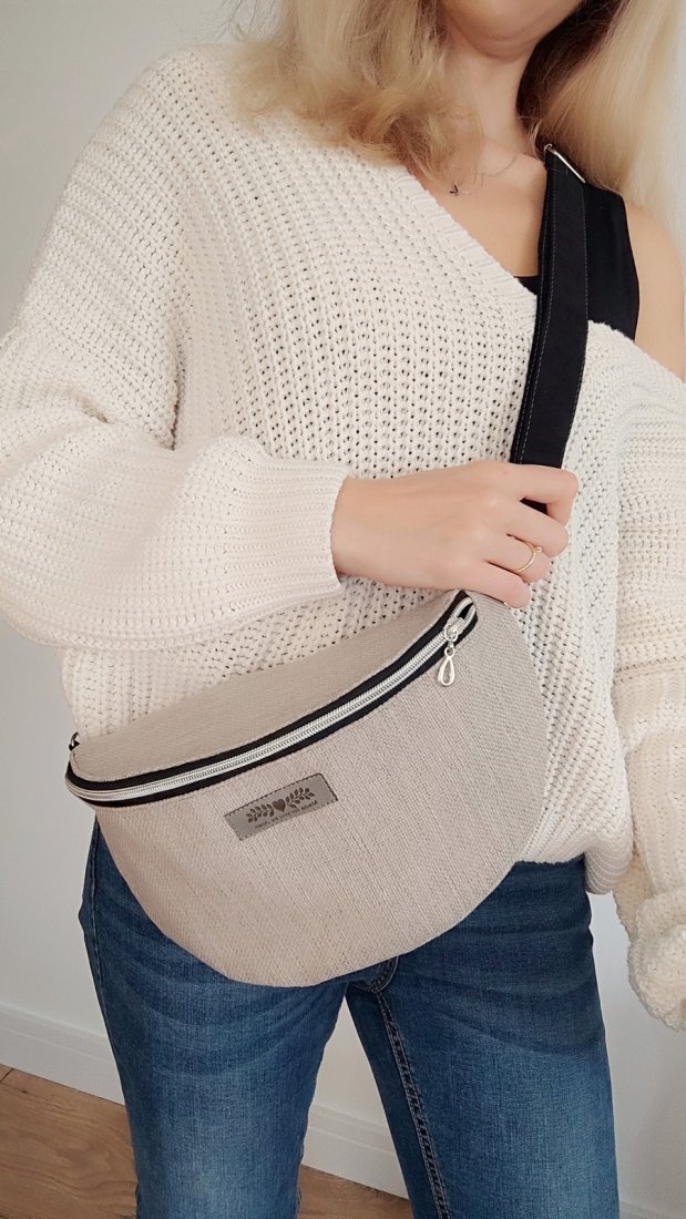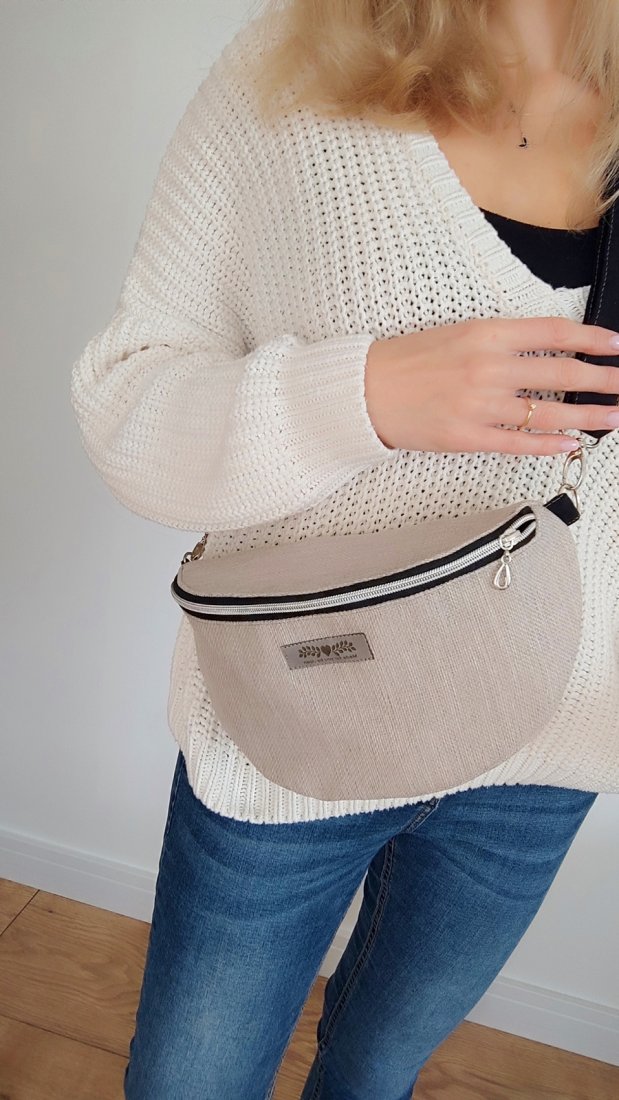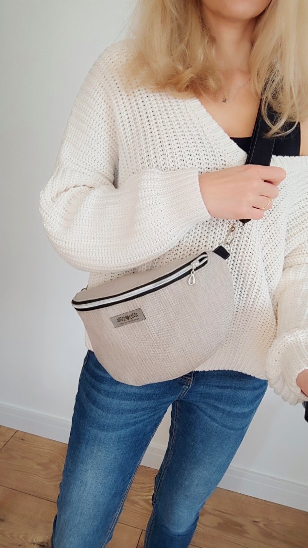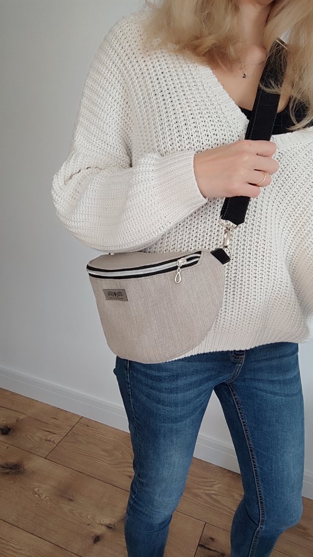 Nerka, saszetka do noszenia na ramieniu z regulowanym paskiem, zapinana na suwak, w środku mała kieszonka na suwak.