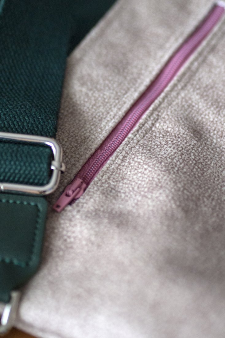 Małe zaszewki na dnie. Z tyłu oraz w środku torebki kieszonki zapinane na suwak. Środek wykończony bawełnianą podszewką.