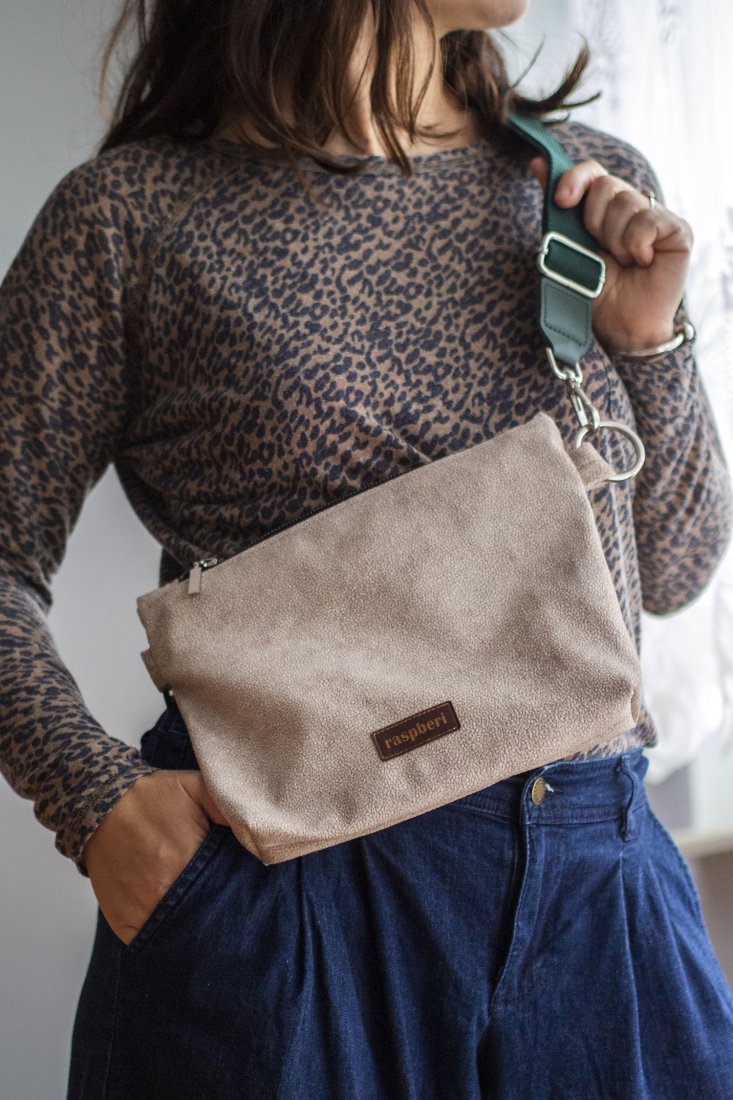 Prosta torebka, kopertówka w średnim rozmiarze wykonana z weluru w kolorze beżowym. Zapinana na suwak.