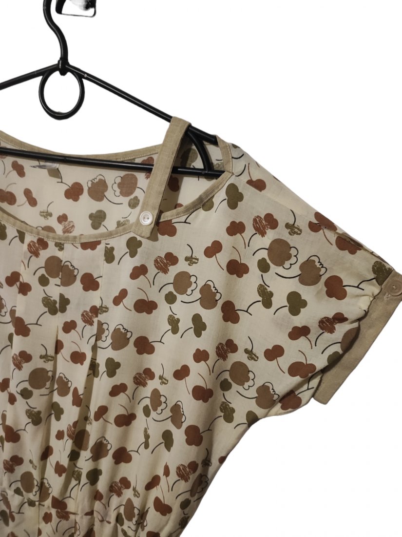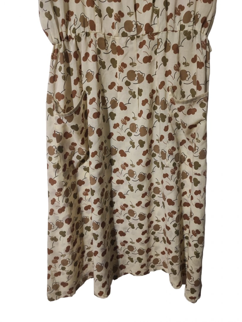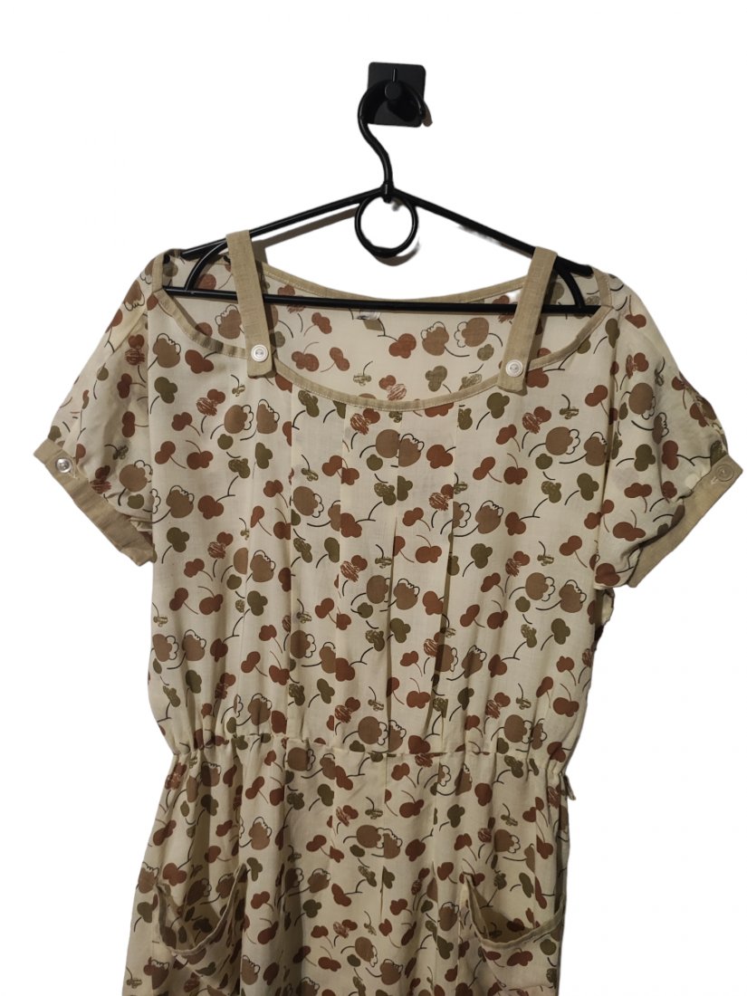 Beżowa sukienka vintage. W liście w różnych odcieniach brązu. Posiada kieszenie na przodzie. Dość cienki materiał. Stan bardzo dobry, brak wad.