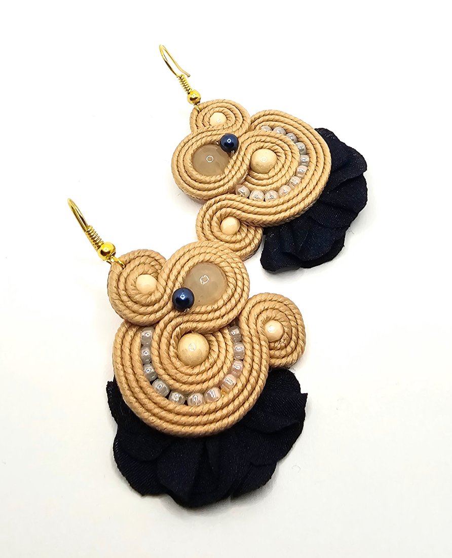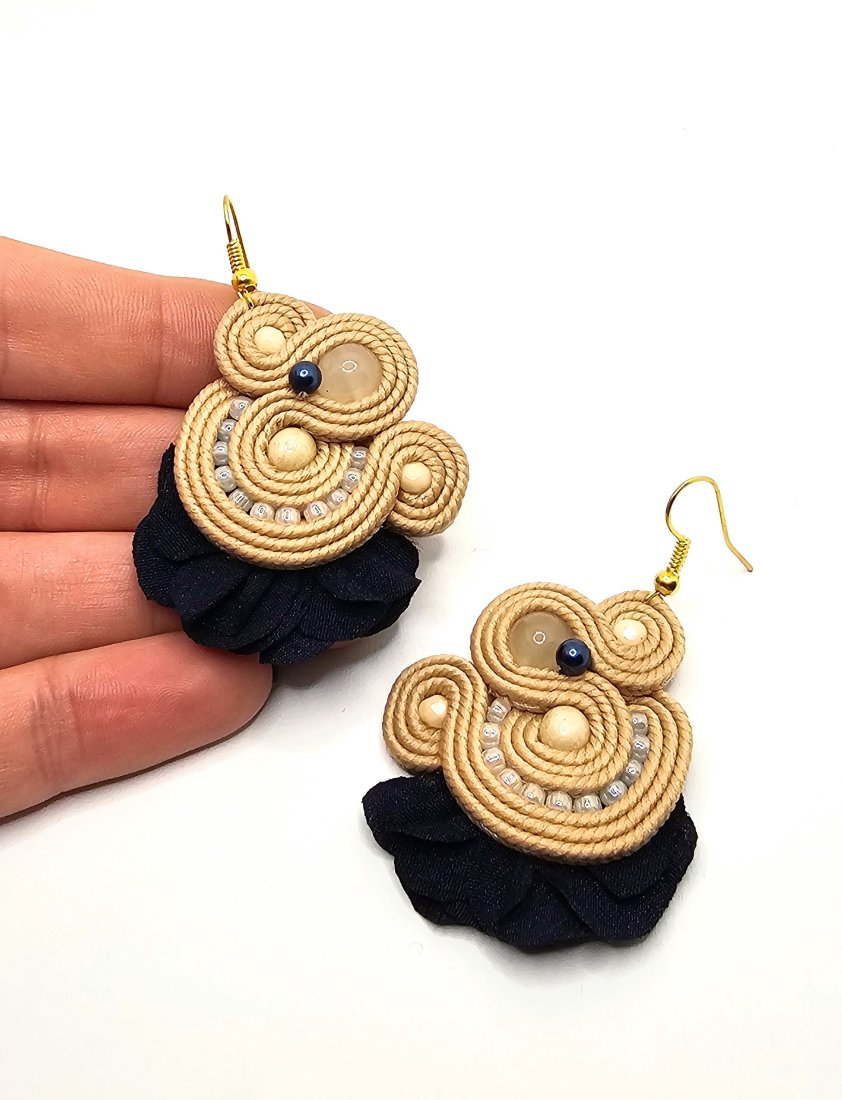 Beżowe wiszące kolczyki sutasz z granatowymi wachlarzami