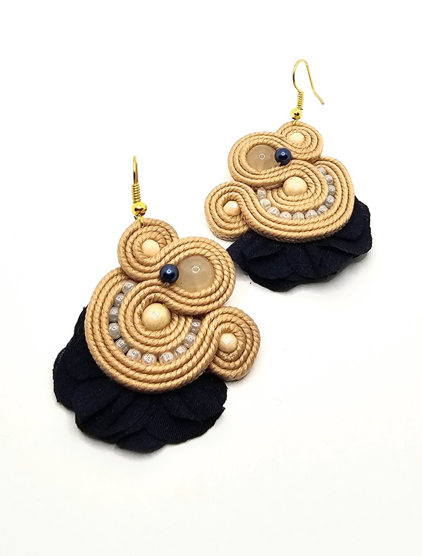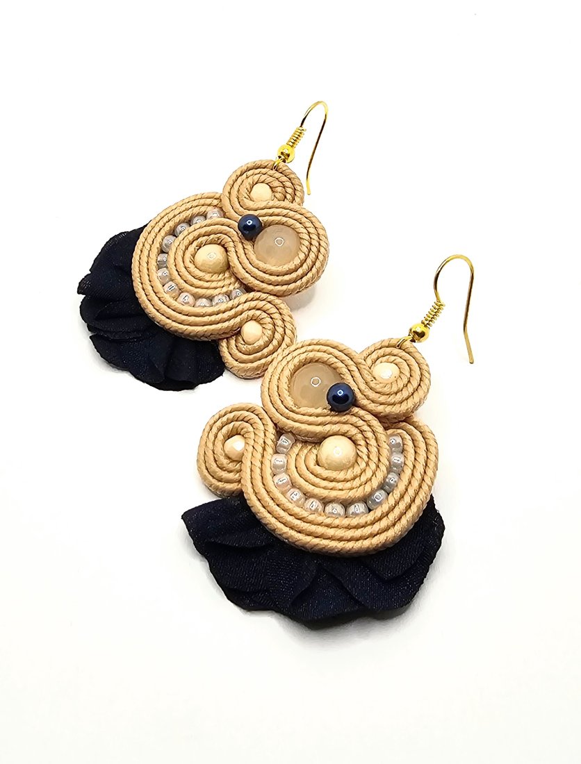 Beżowe szklane kulki otoczone polskimi sznurkami sutasz oraz szklanymi czeskimi i japońskimi koralikami o rożnych kształtach i wielkościach. Dół kolczyków zdobią materiałowe granatowe wachlarze. Kolczyki zawieszone na klasycznych otwartych biglach w kolorze złotym.