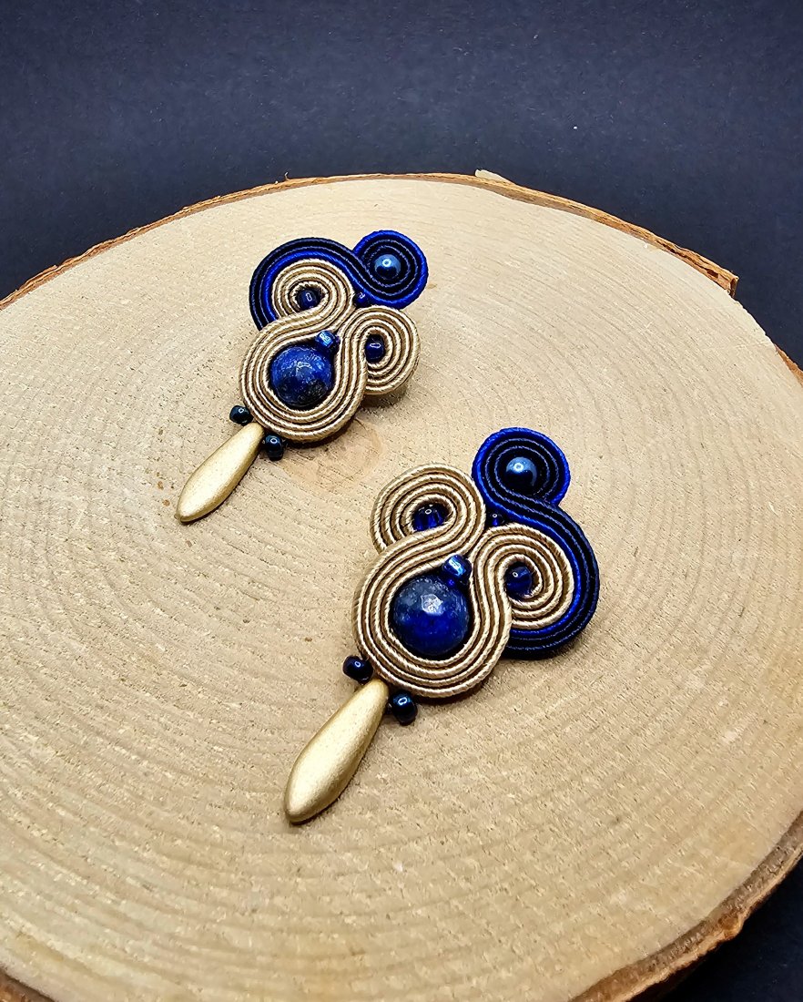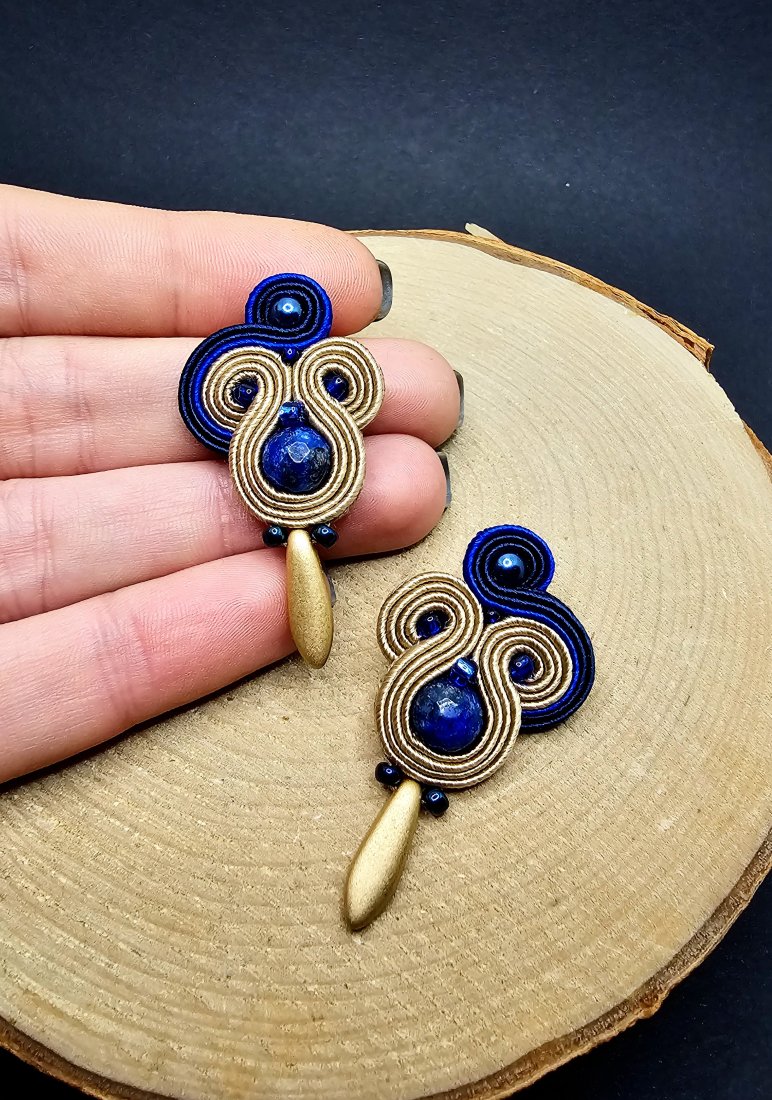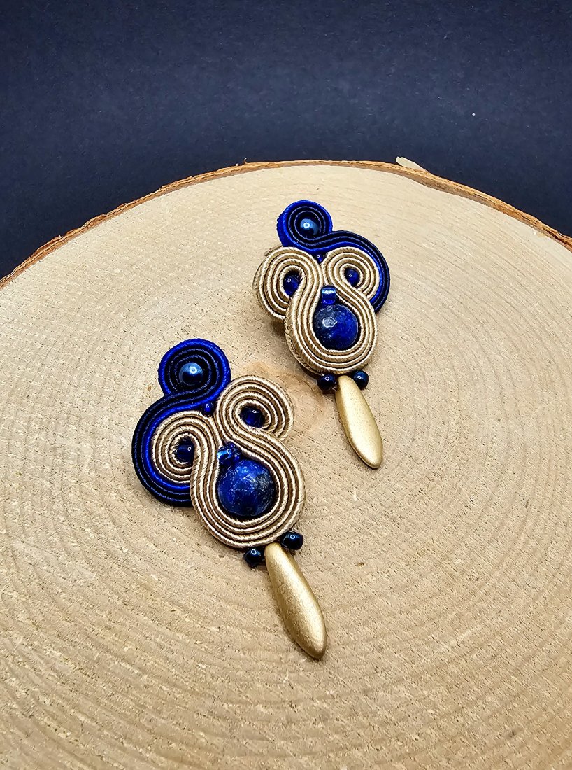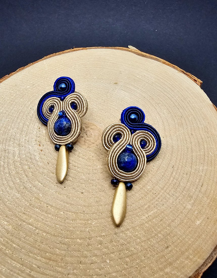 Niebieskie fasetowane kulki jadeitu otoczone sznurkami sutasz oraz szklanymi czeskimi i japońskimi koralikami o rożnych kształtach i wielkościach. Dół kolczyków zdobią szklane wiszące koraliki w kolorze złotym o matowym wykończeniu. Kolczyki zamocowane na sztyftach ze stali chirurgicznej.