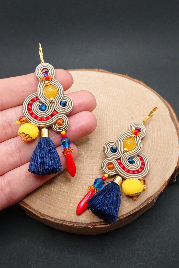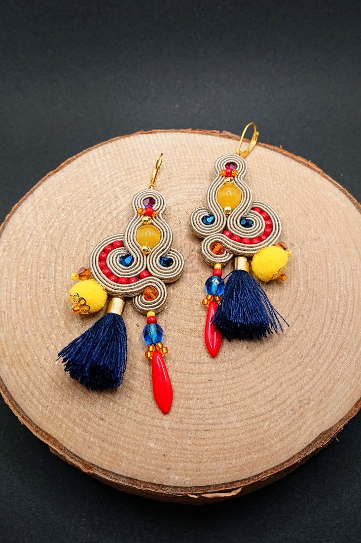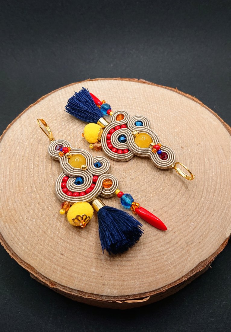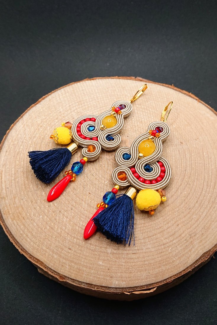 Kolczyki uszyte z beżowego sznurka wypełnionego szklanymi koralikami oraz drobnymi kryształkami. Kolory w kolczykach: beżowy, żółty, czerwony, pomarańczowy, granatowy. Dół kolczyków zdobią szklane koraliki o różnych kształtach, frędzle w złotej oprawie oraz pompony. Kolczyki zawieszone na biglach angielskich w kolorze złotym.