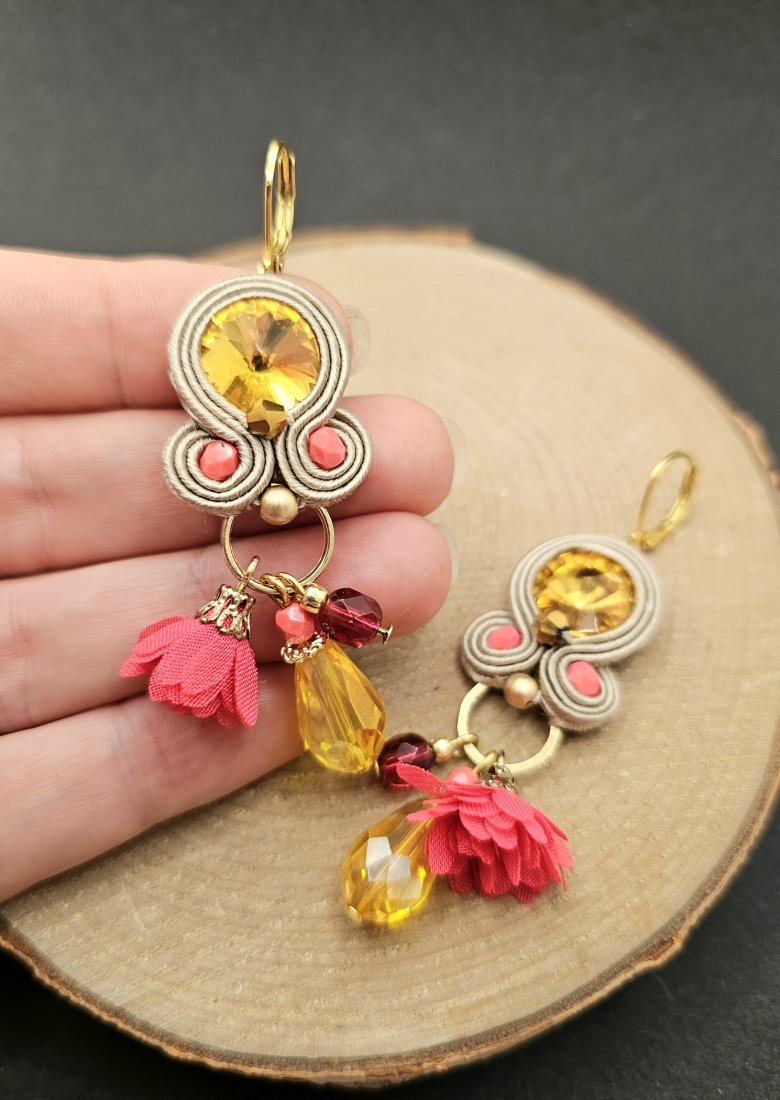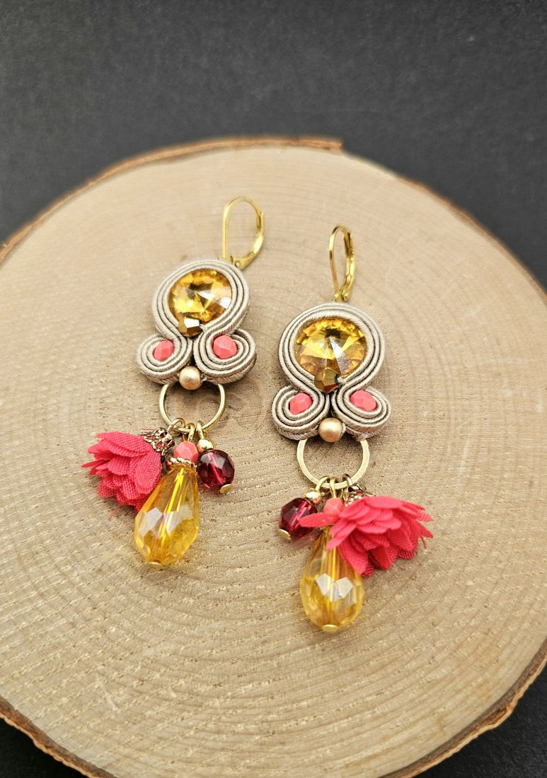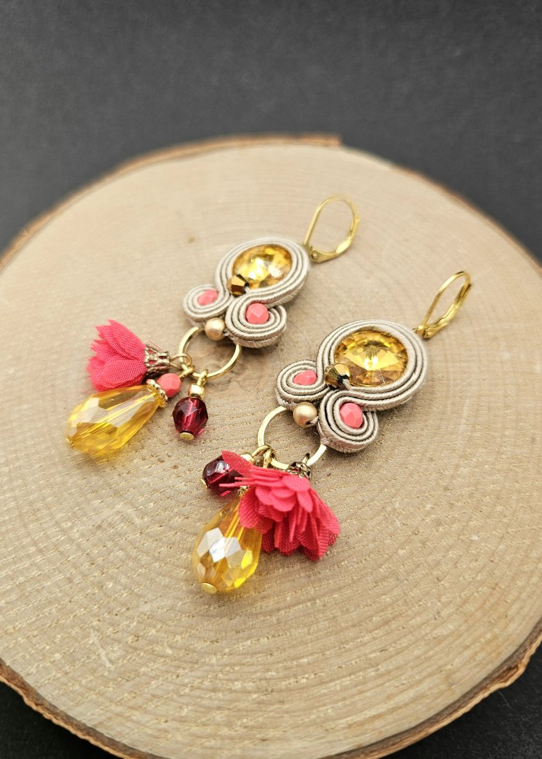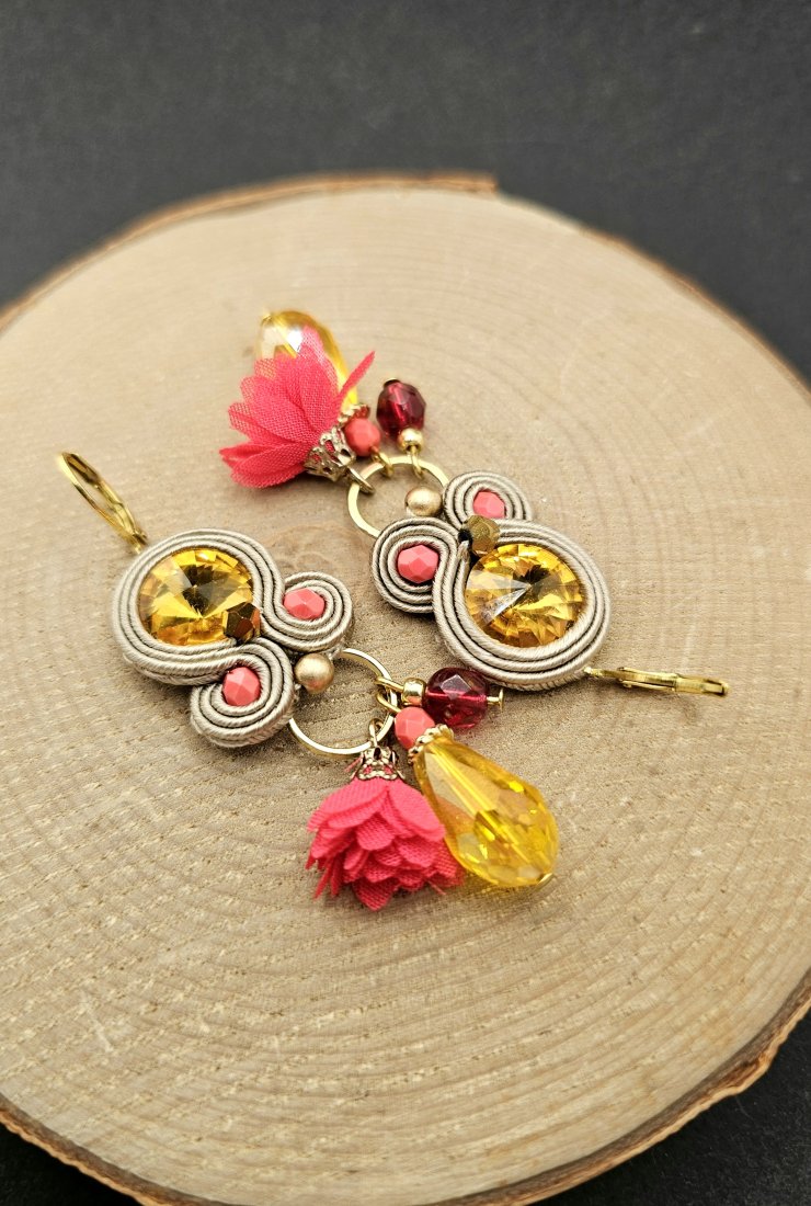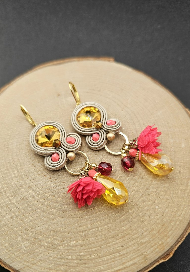 Szklane fasetowane kryształki otoczone sznurkami sutasz oraz szklanymi koralikami. Dół kolczyków zdobią ozdobne błyszczące zawieszki z koralików i kryształków. Kolczyki zawieszone na biglach angielskich w kolorze złotym. Kolorystyka kolczyków: beżowy, żółty, koralowy, fuksja, złoty.