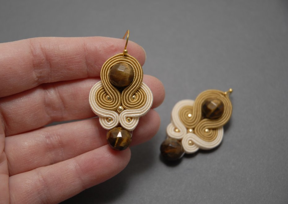Oferuję kolczyki zrobione techniką sutasz, ozdobione fasetowanym tygrysim okiem i drobnymi koralikami
