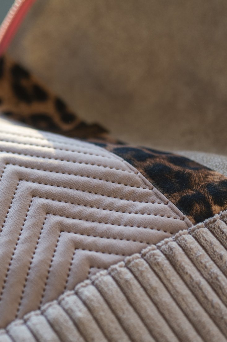 Duży, damski plecak miejski zapinany na suwak z kilku rodzajów kolorowych tkanin w połączeniu z welurem w panterkę.