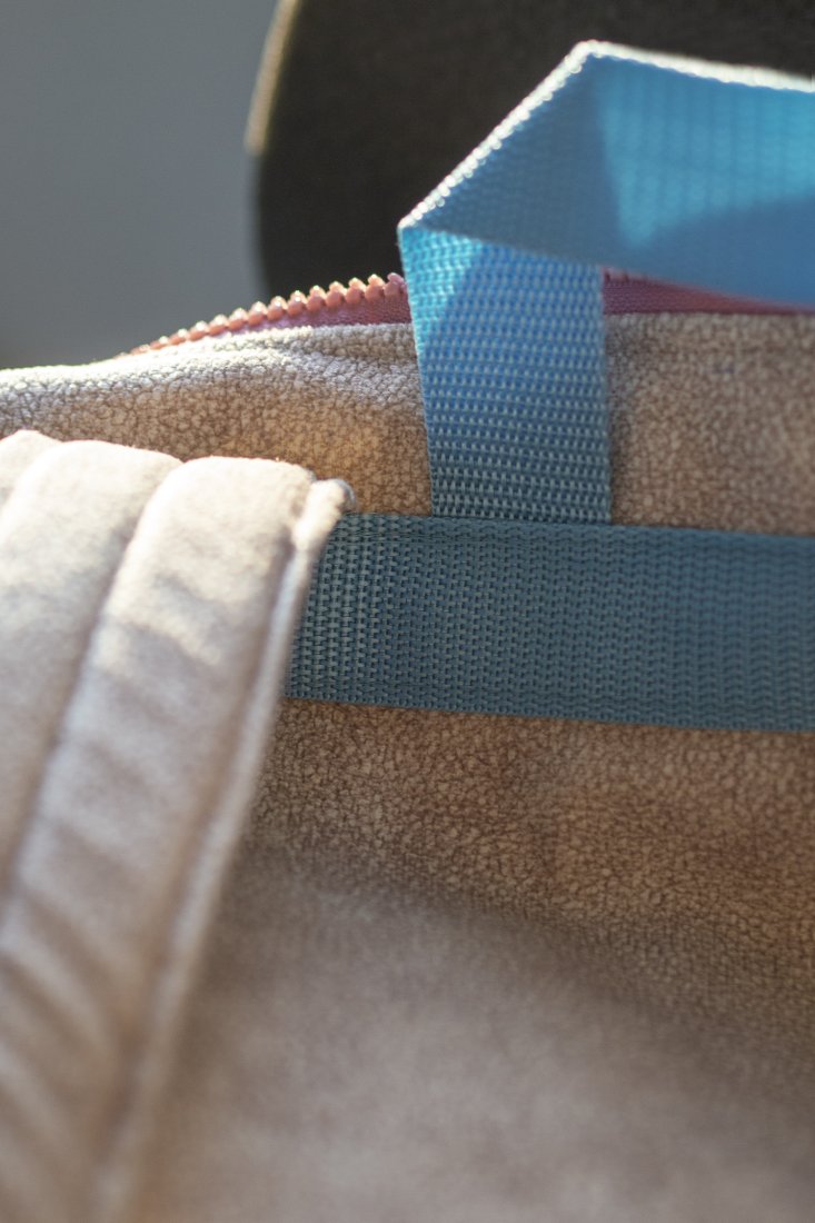 Regulowane paski. W środku wzorzysta, bawełniana podszewka oraz mała kieszonka na suwak.