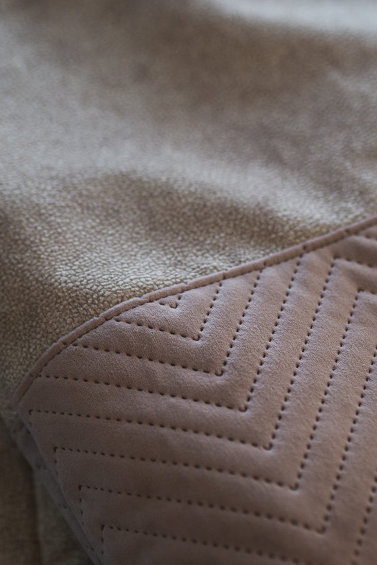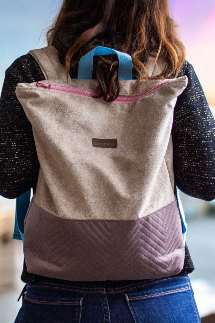 Duży, damski plecak miejski zapinany na suwak wykonany z beżowego weluru oraz pikowanego pudroworóżówego weluru.