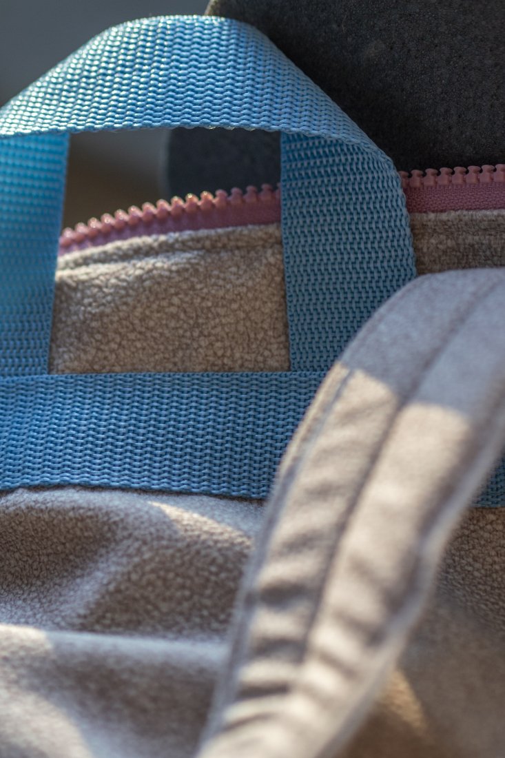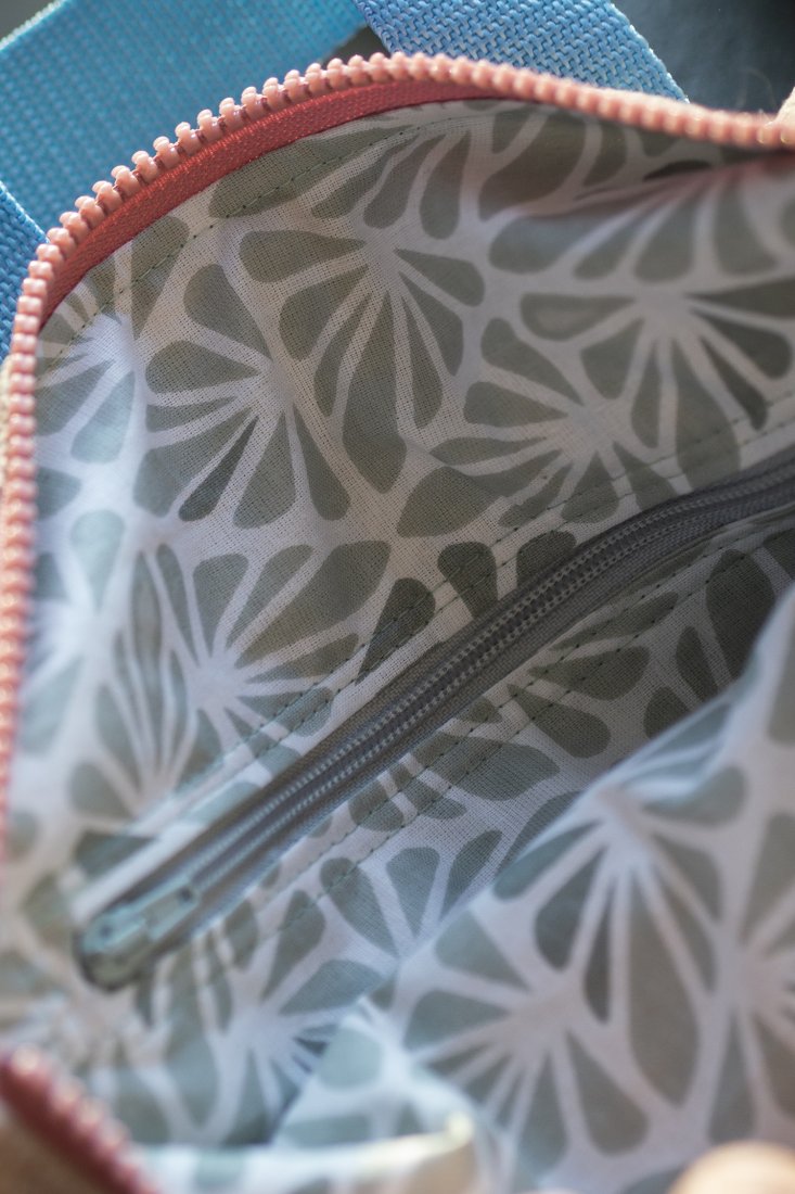 Regulowane paski. W środku wzorzysta, bawełniana podszewka oraz mała kieszonka na suwak.