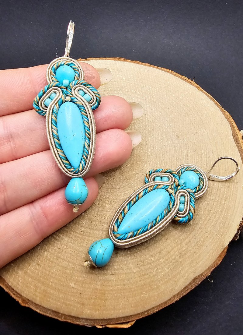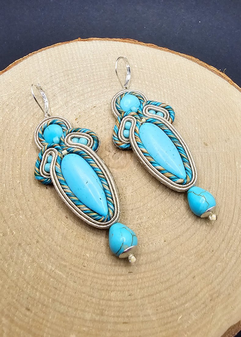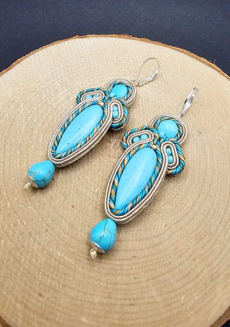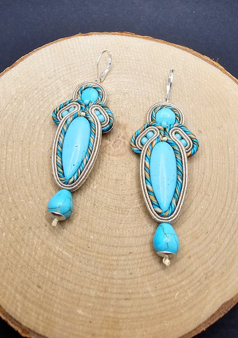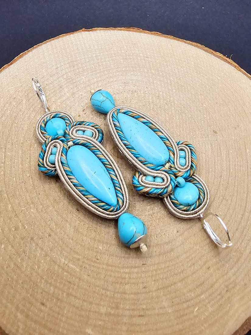Turkusowe kamienie howlitu otoczone sznurkami sutasz oraz szklanymi japońskimi koralikami. Dół kolczyków zdobią niewielkie krople howlitu. Kolczyki zamocowane na metalowych biglach angielskich w kolorze srebrnym.