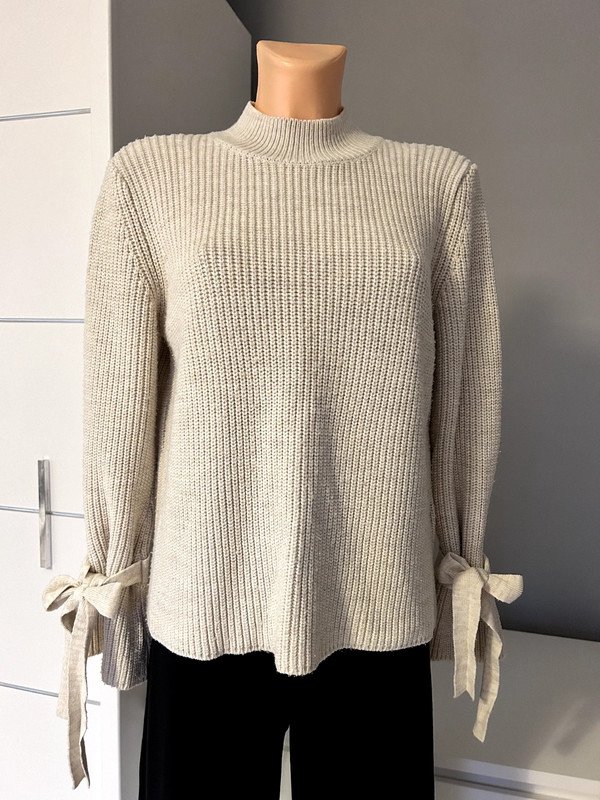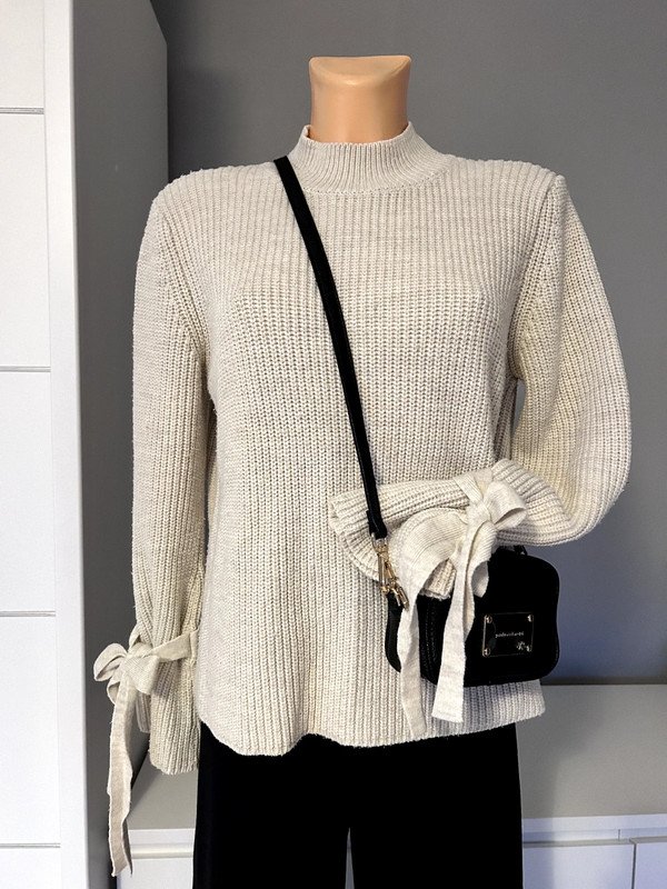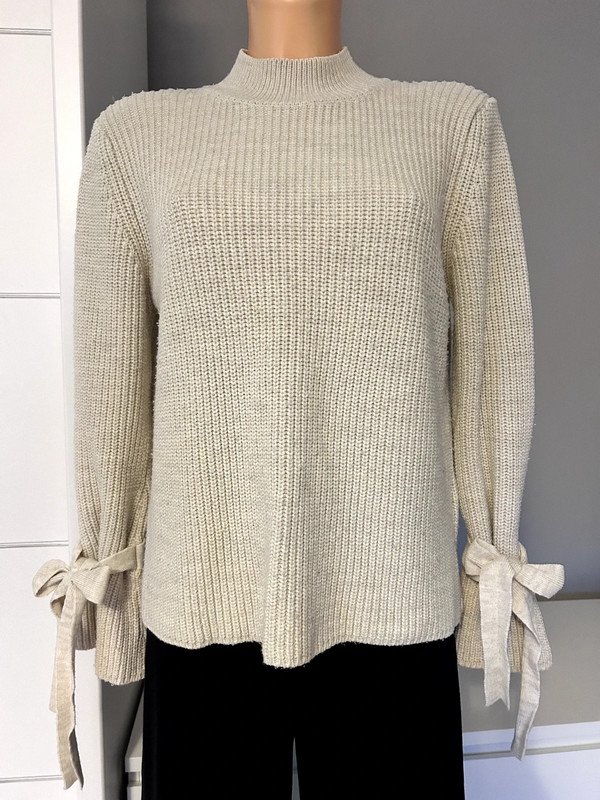 Sweter półgolf Gina Tricot w kolorze beżowym, rozmiar S z metki będzie dobry również na M. Ciekawe wiązane rękawy. Old money style, szafa kapsułowa.