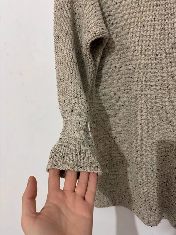 Miękki, luźny sweter damski w odcieniu beżowego melanżu. Model oversize z lekko poszerzanymi rękawami i delikatną fakturą dzianiny. Idealny na chłodniejsze dni – bardzo wygodny, nie gryzie, dobrze się układa na sylwetce.