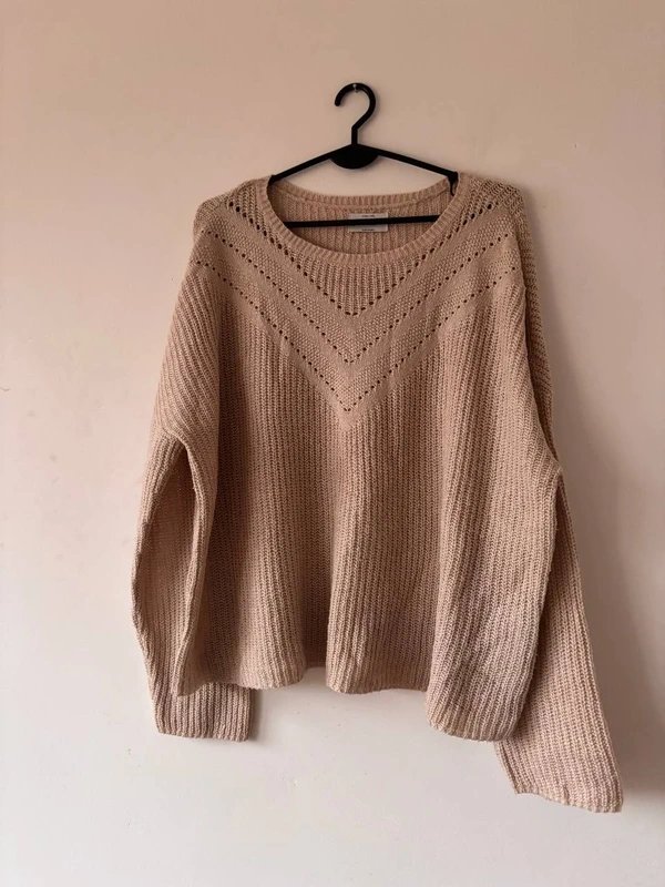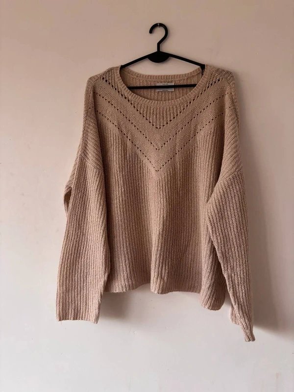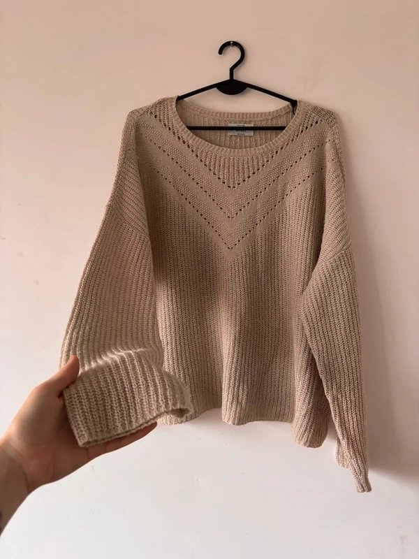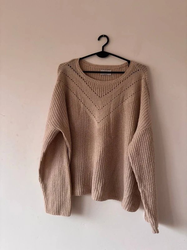 Miękki, beżowy sweter z delikatnym ażurowym wzorem w kształcie litery "V" na dekolcie i ramionach.