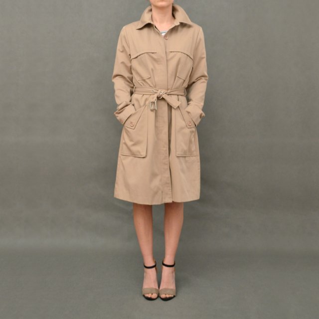Trencz vintage w beżowym kolorze. Zapinany na guziki, w talii pasek z klamerką. Ma ładnie wywinięte kieszenie. Na podszewce.
