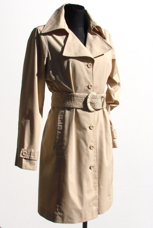 damski lekki płaszczyk, delikatnie wciety, podszewka w kolorze płaszcza ( bardzo jasna kawa z mlekiem), dwie nakładane kieszenie, oryginalny, pleciony pasek, stan idealny ( Reserved)