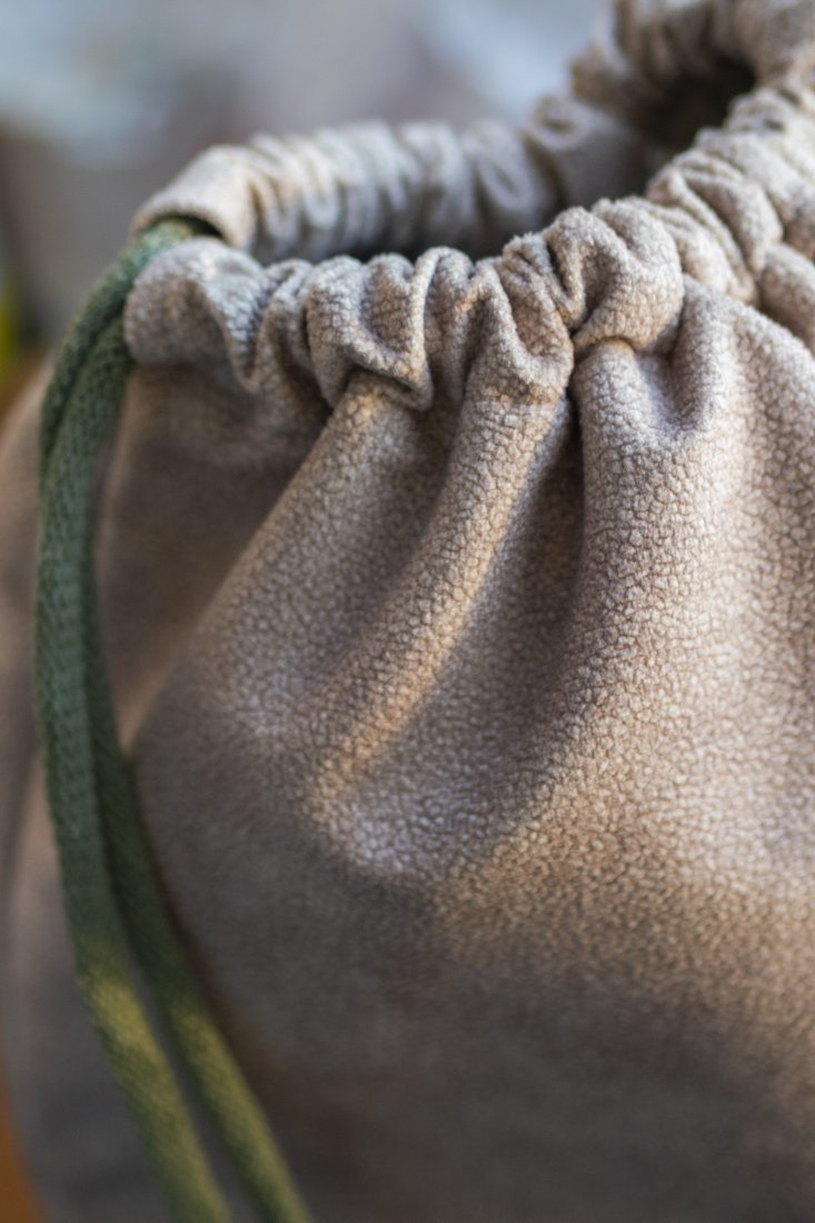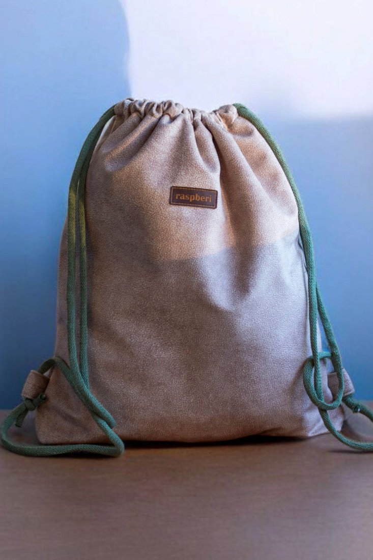 Plecak worek w kolorze beżowym wykonany z weluru.